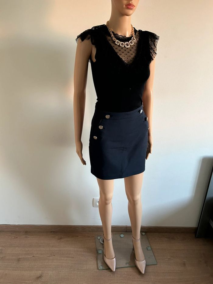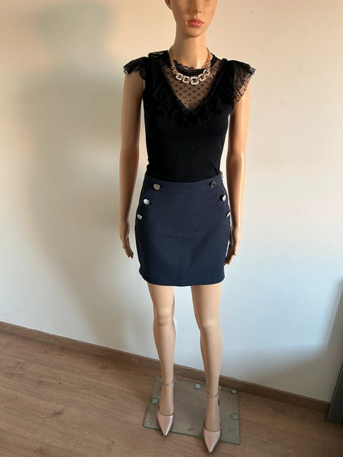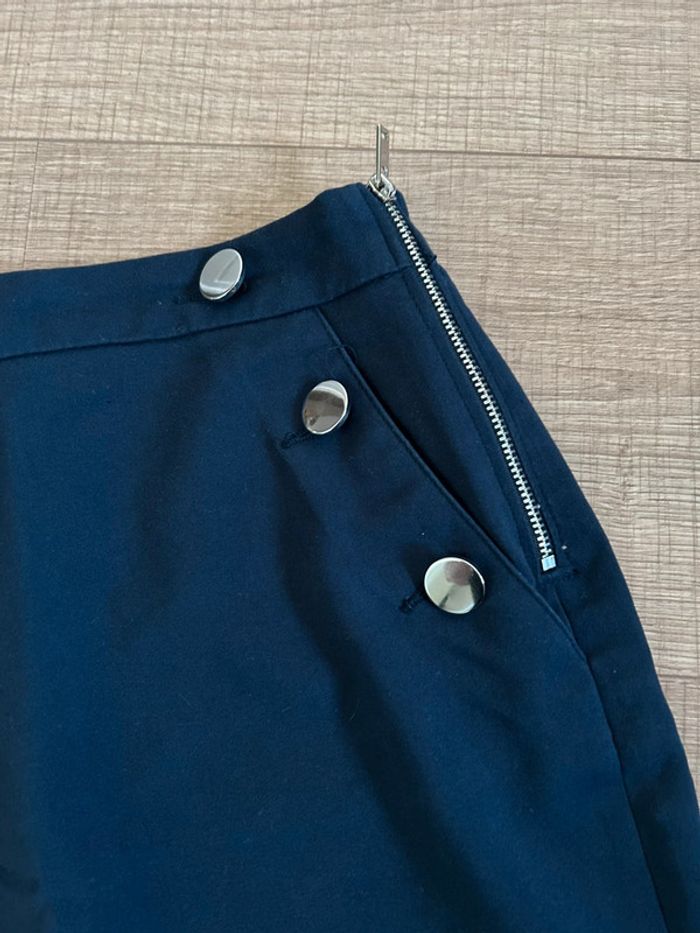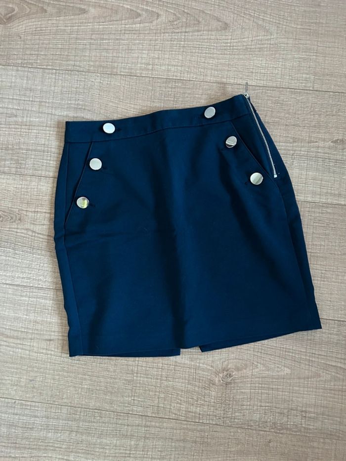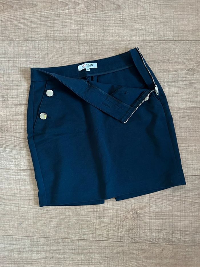 Jolie jupe bleue marine avec boutons argentés, de marque Morgan. Fermeture sur le côté. Taille 34. Peu portée, en excellent état. taille 33 cms longueur 40 cms Étiquette intérieure de composition coupée Le prix reste négociable dans la limite du raisonnable. Un petit cadeau dans le colis 🌸