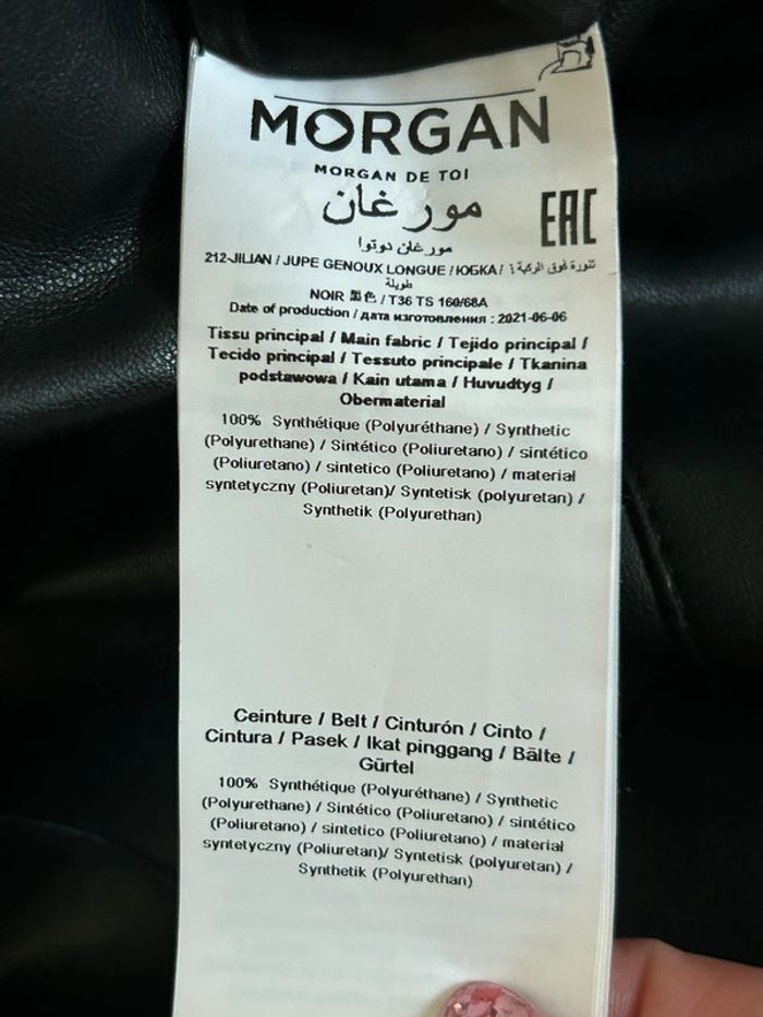 Magnifique jupe noire mi longue en simili cuir, de marque Morgan. Taille 36. Jamais portée, état neuf. taille 35 cms longueur 68 cms 100% synthétique Le prix reste négociable dans la limite du raisonnable. Un petit cadeau dans le colis 🌸