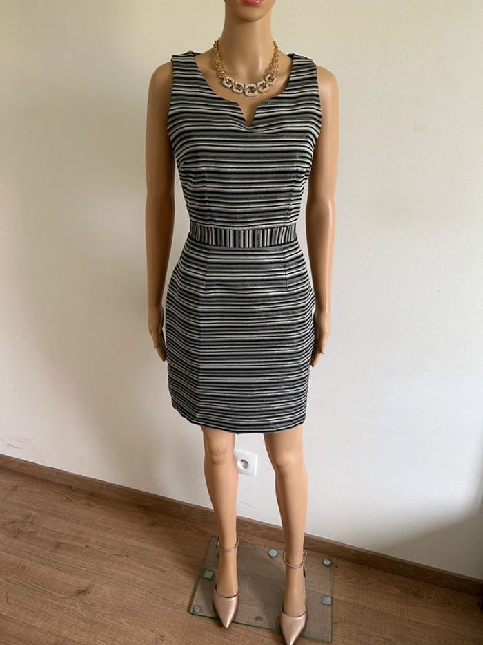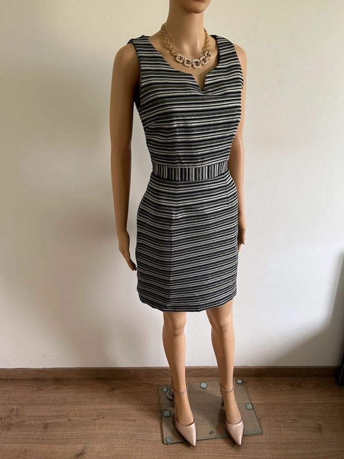 Magnifique robe rayée sans manches, grise et dorée, de marque LolaLiza. Fermeture sur le côté. Taille française 36. Jamais portée, état neuf. aisselle à aisselle 42 cms taille 36 cms longueur depuis épaule 87 cms 100% polyester Le prix reste négociable dans la limite du raisonnable. Un petit cadeau dans le colis 🌸 (Boîte 42)