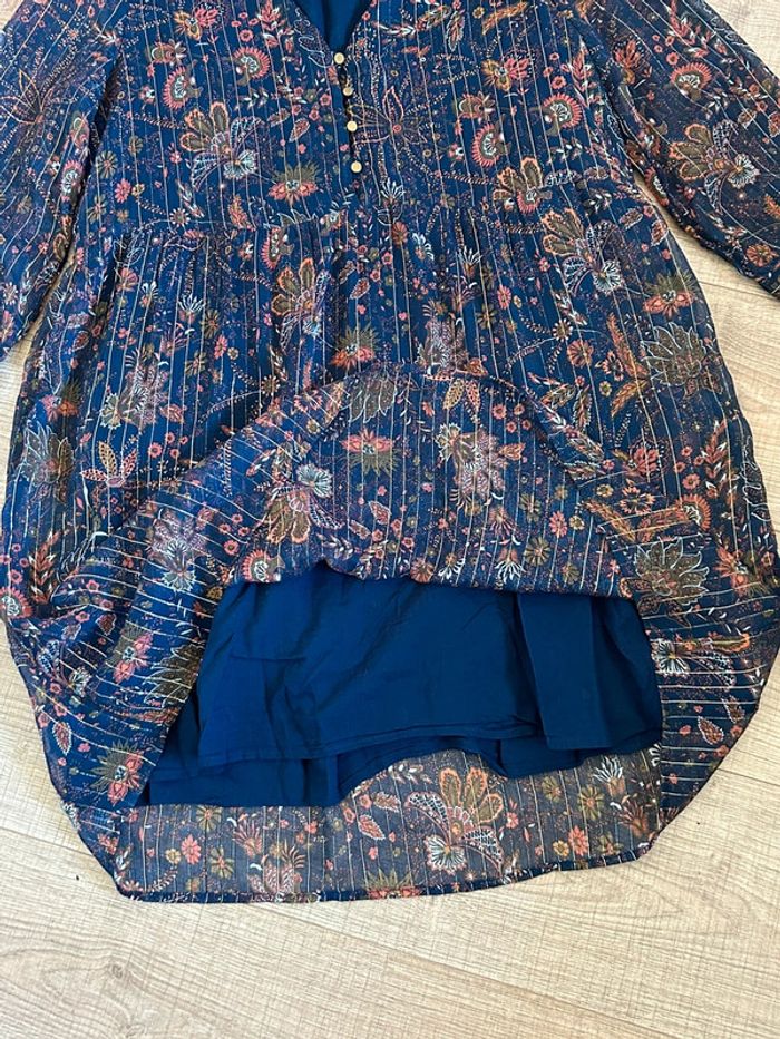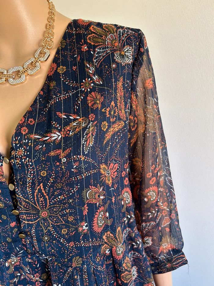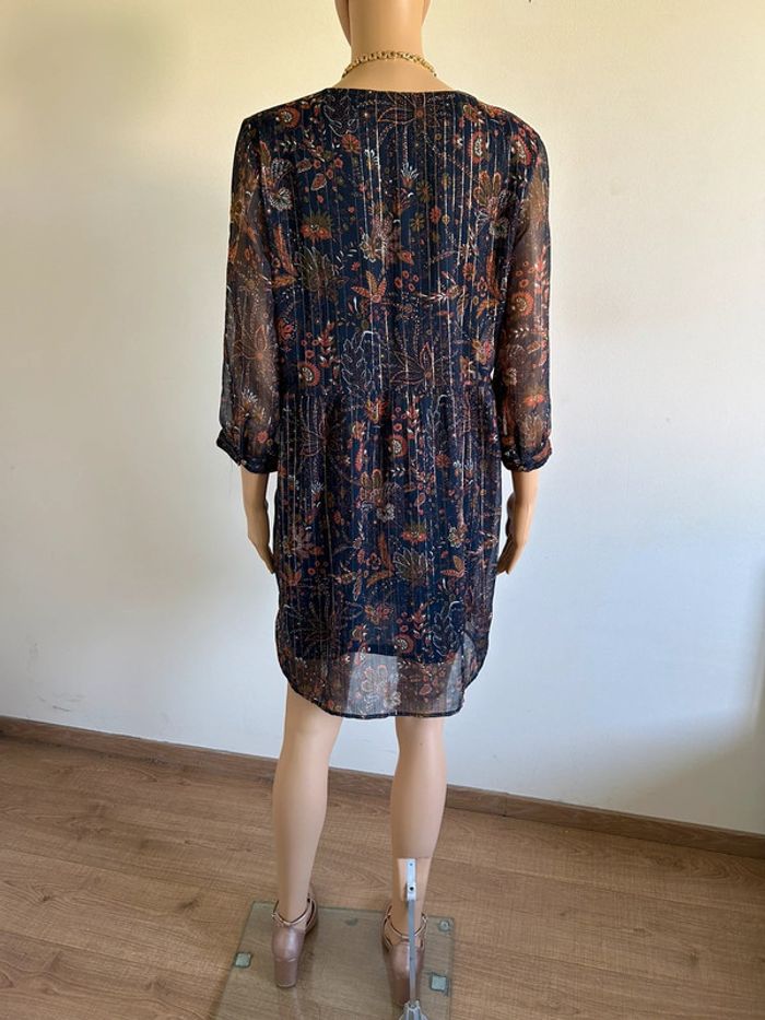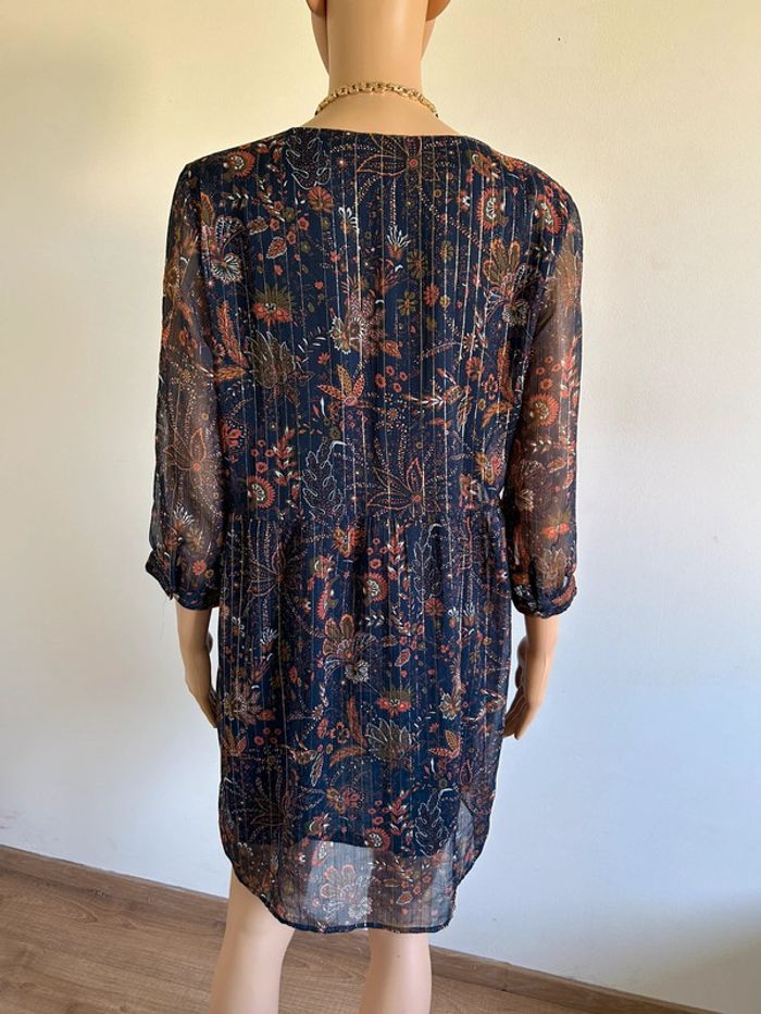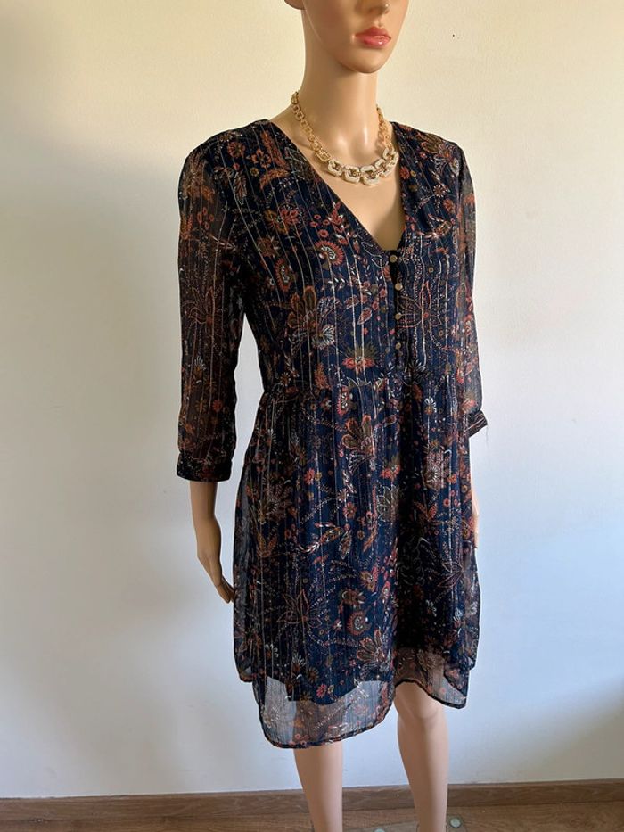 Jolie robe imprimée à manches 3/4, avec liserés dorés, de marque Vero Moda. Taille M. Jamais portée, état neuf. aisselle à aisselle 50 cms épaule à épaule 41 cms taille 47 cms longueur depuis épaule 87 cms 100% coton Le prix reste négociable dans la limite du raisonnable. Un petit cadeau dans le colis 🌸 (Boîte 25)