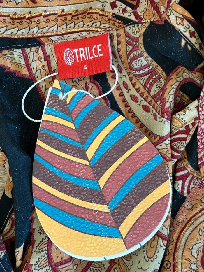 Magnifique robe longue imprimée sans manches, de marque Trilce. Boutons noirs sur tout le devant. Taille S. Elle est neuve avec étiquette. aisselle à aisselle 44 cms taille 36 cms longueur depuis épaule environ 150 cms 100% polyester Le prix reste négociable dans la limite du raisonnable. Un petit cadeau dans le colis 🌸