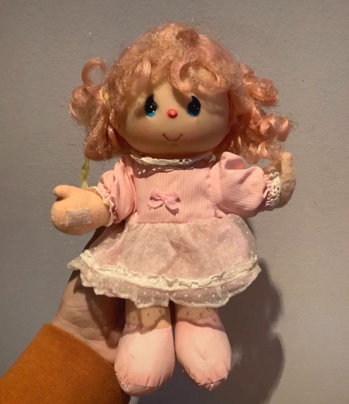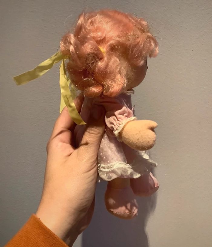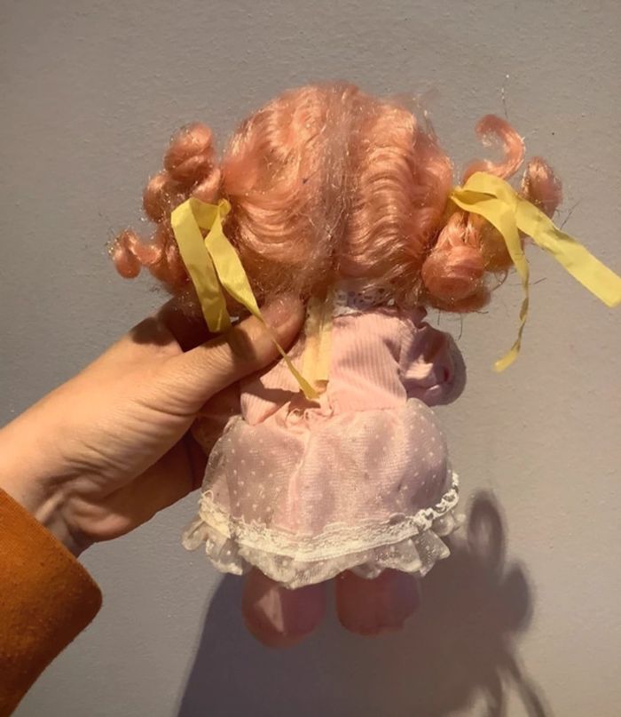 Petite poupee d environ 20 cédé haut , bon etat annees 1982 sa tête est en plastique et son corps en tissus. C est cheveux rose pailleté