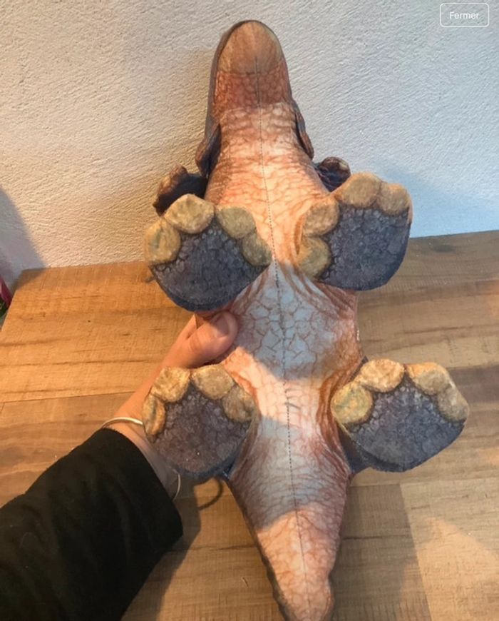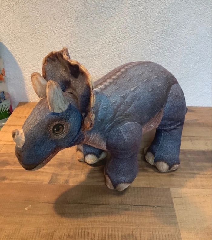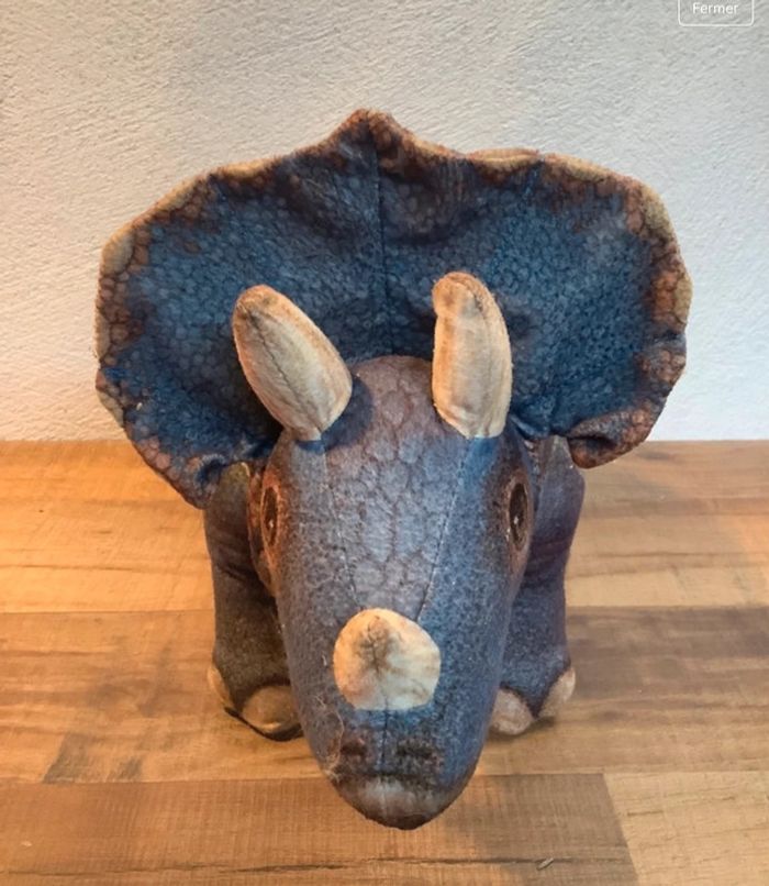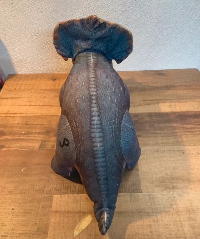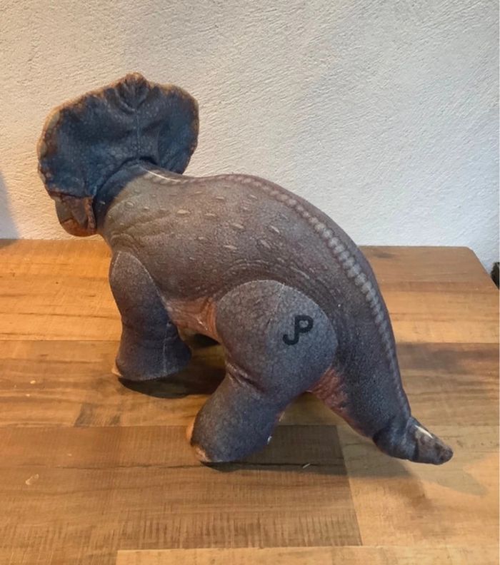 Peluche tricératops Jurassic Park annees 90 bon etat 40 cm de long 22 cm de haut à noter il y a un petit point de couture qui a été effectuer sur le flan voir photo détail