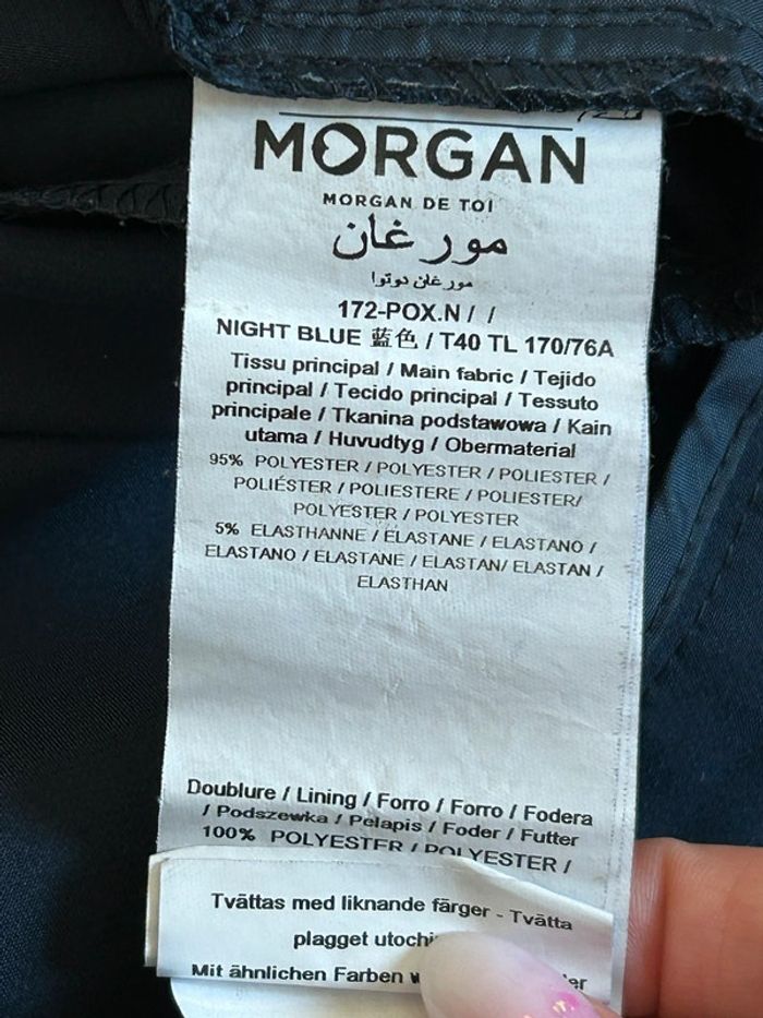 Joli pantalon bleu marine de marque Morgan. Taille 40. Jamais porté, état neuf. taille 40 cms longueur 93 cms longueur entrejambes 69 cms 95% polyester et 5% elasthanne Le prix reste négociable dans la limite du raisonnable. Un petit cadeau dans le colis 🌸