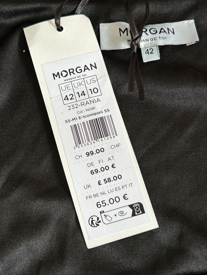 Magnifique robe noire à manches longues, de marque Morgan. Taille 42. Elle est neuve avec étiquette (valeur 65€). aisselle à aisselle 46 cms et plus épaule à épaule 38 cms et plus longueur manches 60 cms taille 41 cms et plus longueur depuis épaule 88 cms Le tissu est extensible 97% polyester et 3% elasthanne Le prix reste négociable dans la limite du raisonnable. Un petit cadeau dans le colis 🌸 (Boîte 22)