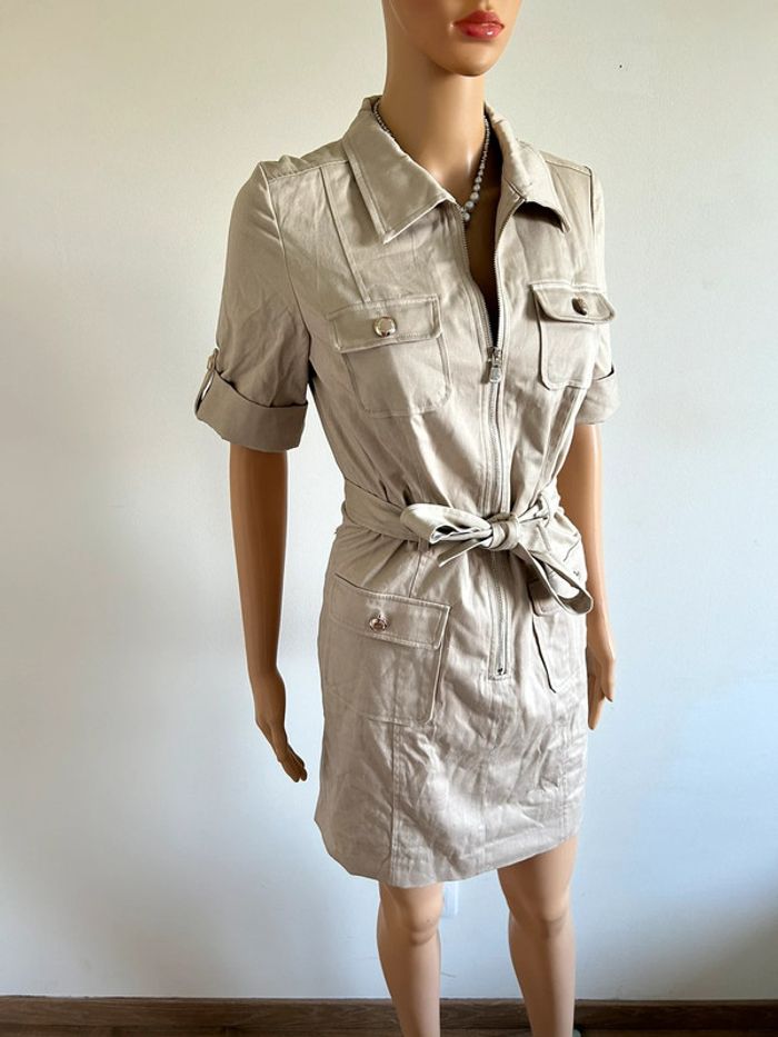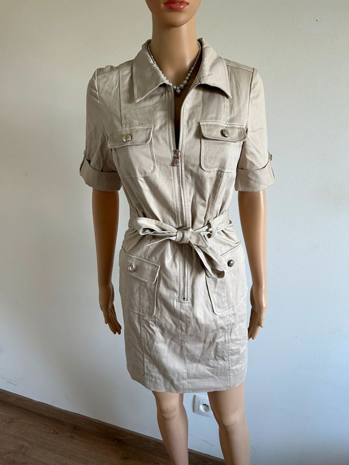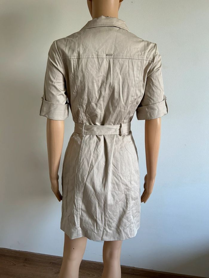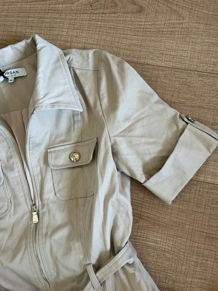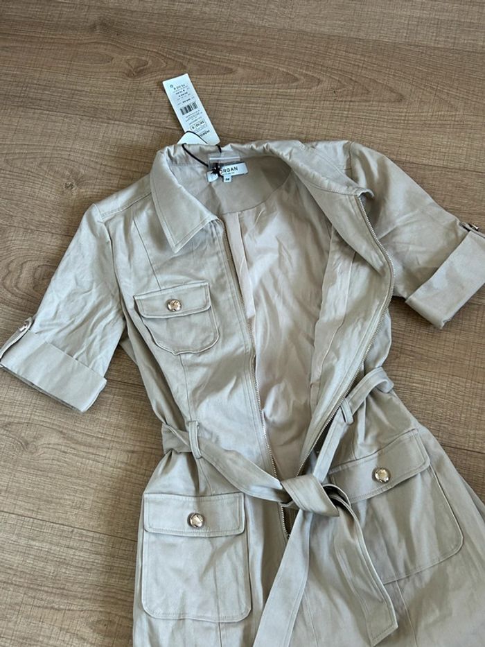 Magnifique robe beige à manches courtes, de marque Morgan. Fermeture et ceinture sur le devant. Taille 38. Elle est neuve avec étiquette (valeur 75€). aisselle à aisselle 44 cms épaule à épaule 38 cms taille 38 cms longueur depuis épaule 87 cms 97% coton et 3% elasthanne Le prix reste négociable dans la limite du raisonnable. Un petit cadeau dans le colis 🌸 (Boîte 26)