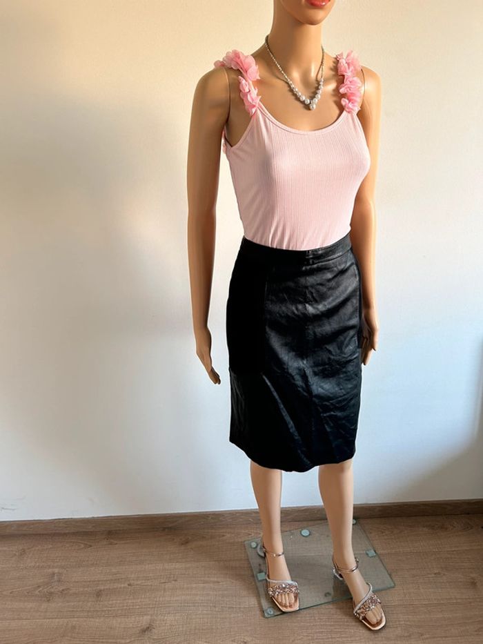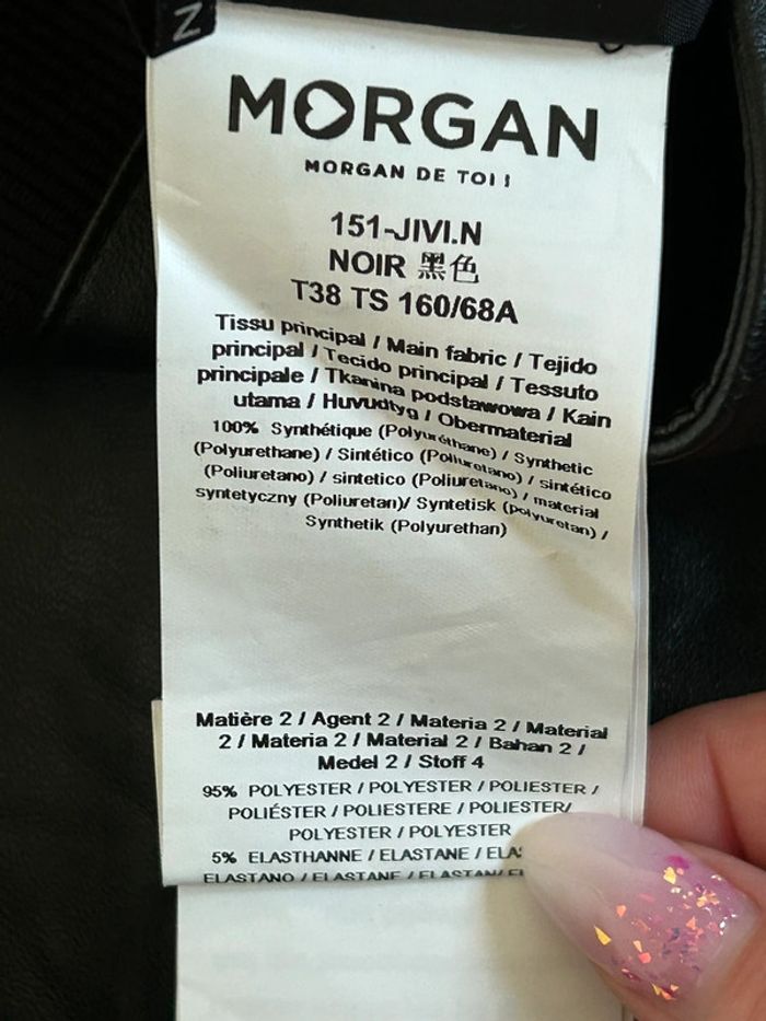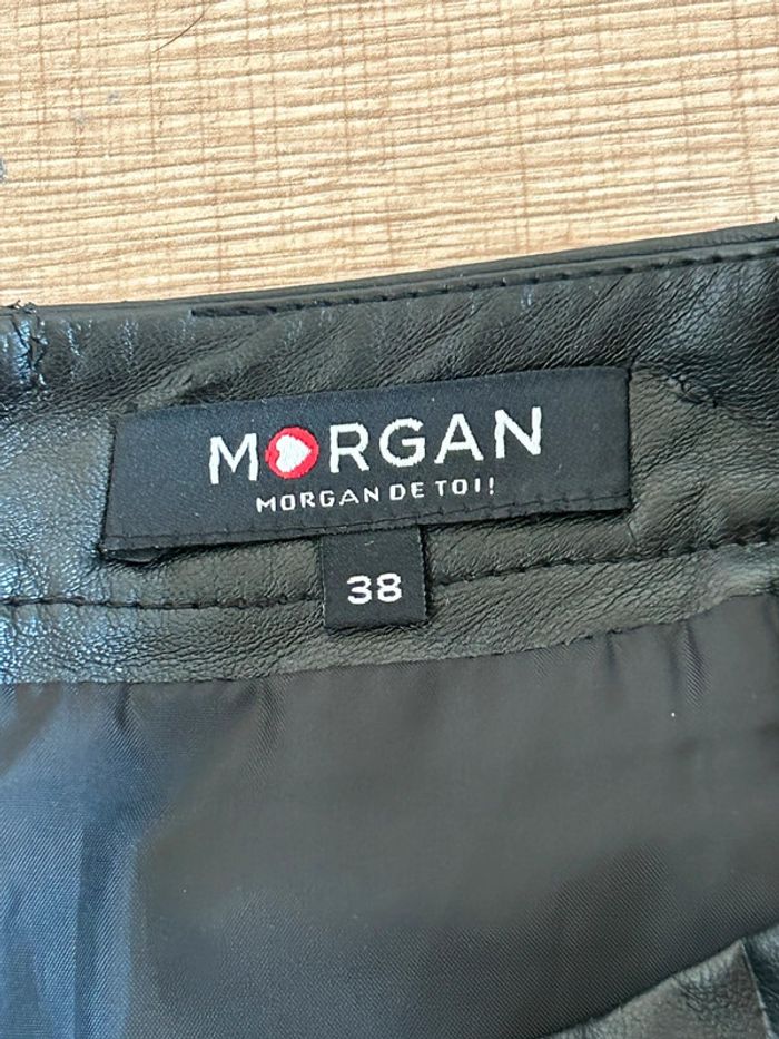 Jolie jupe noire mi longue, avec simili cuir, de marque Morgan. Fermeture à l’arrière. Taille 38. Portée plusieurs fois, en bon état. taille 37 cms longueur 61 cms 100% synthétique