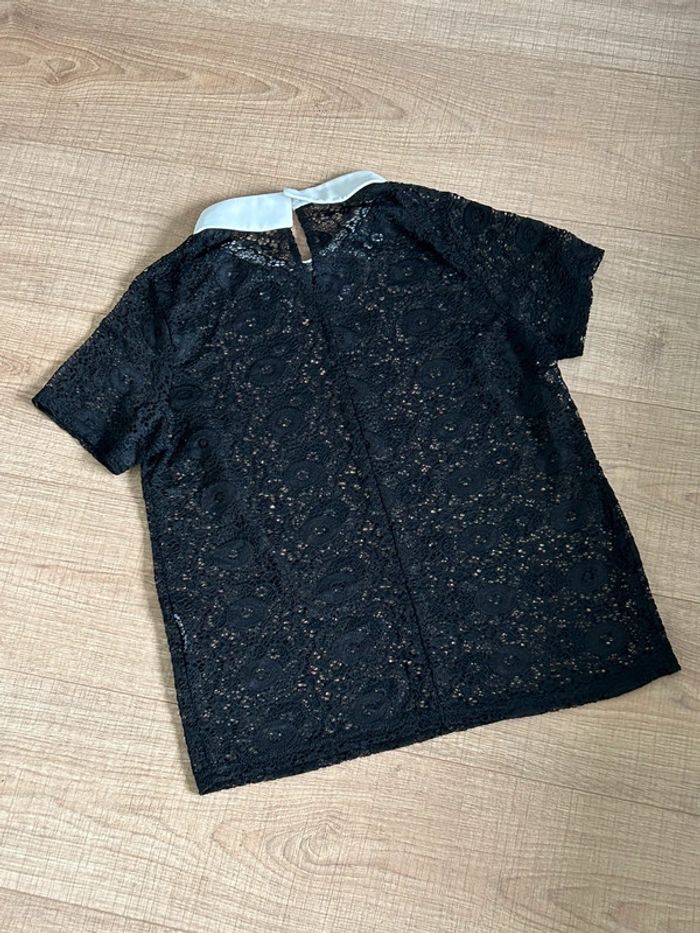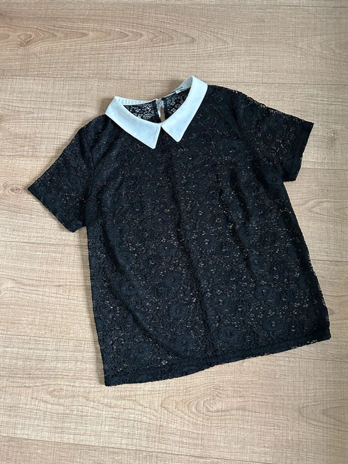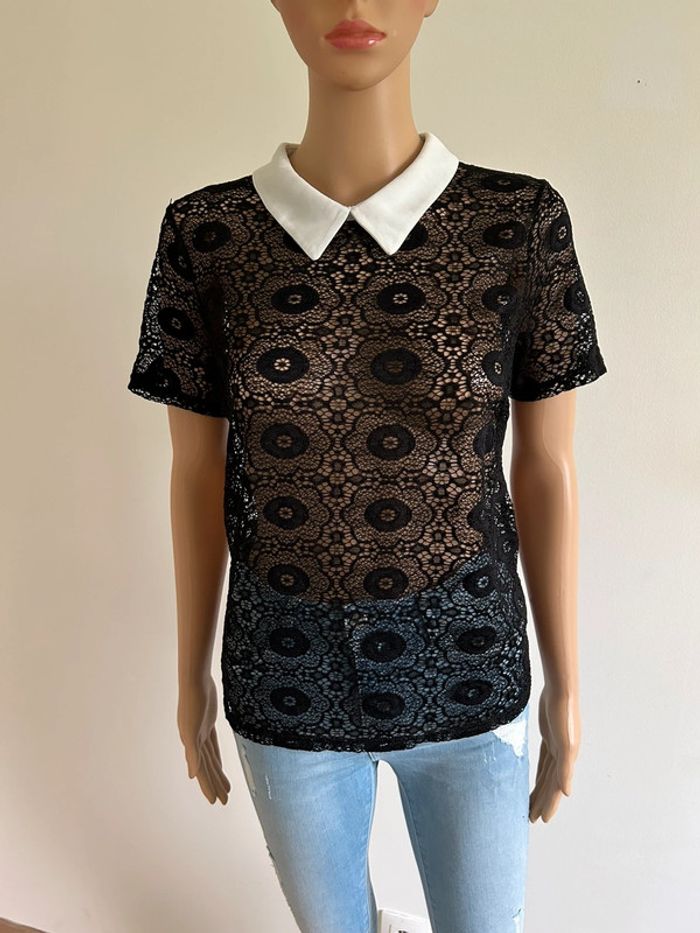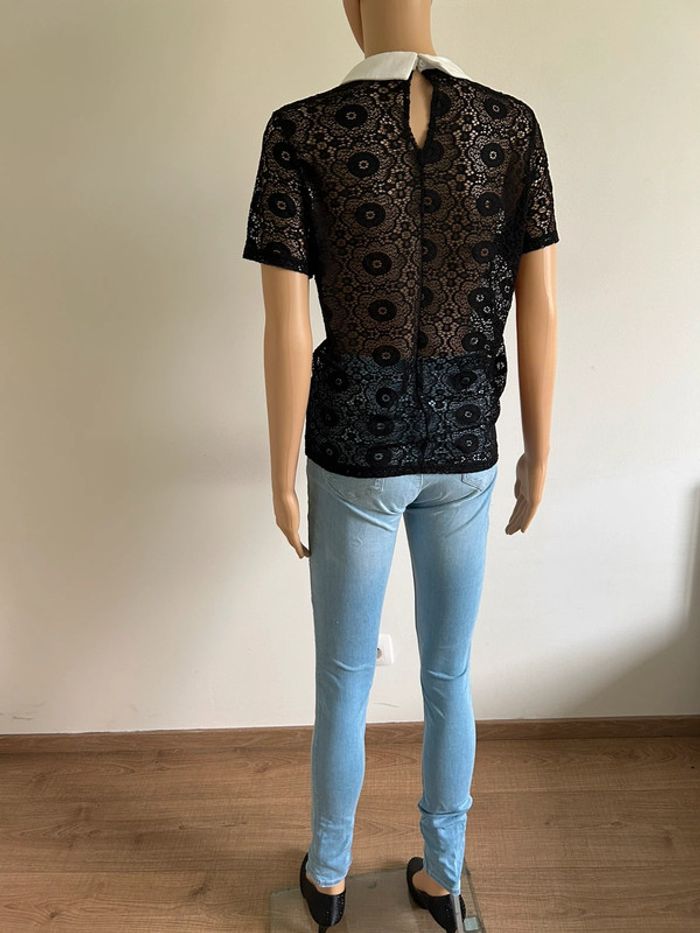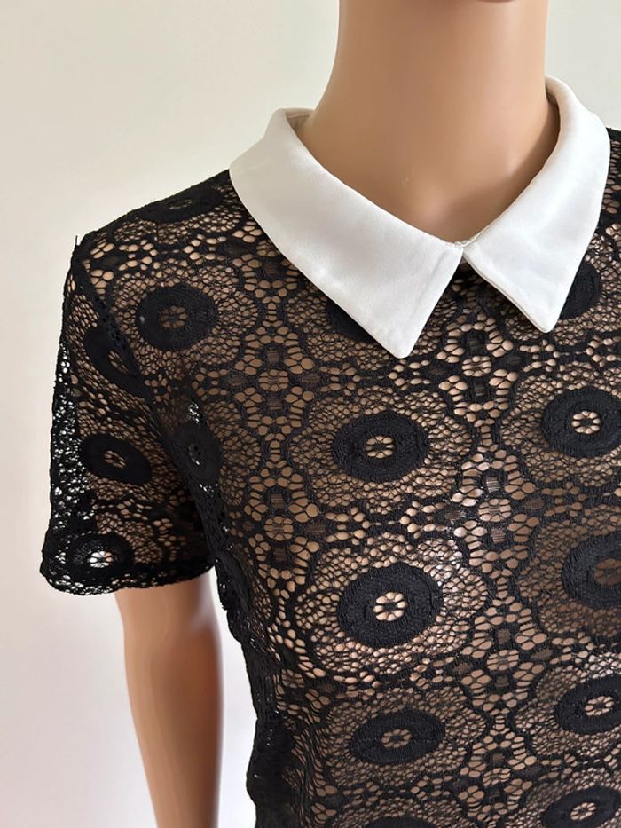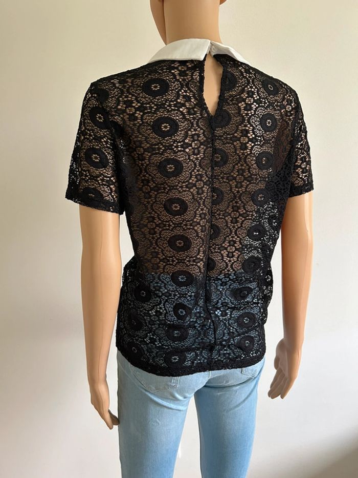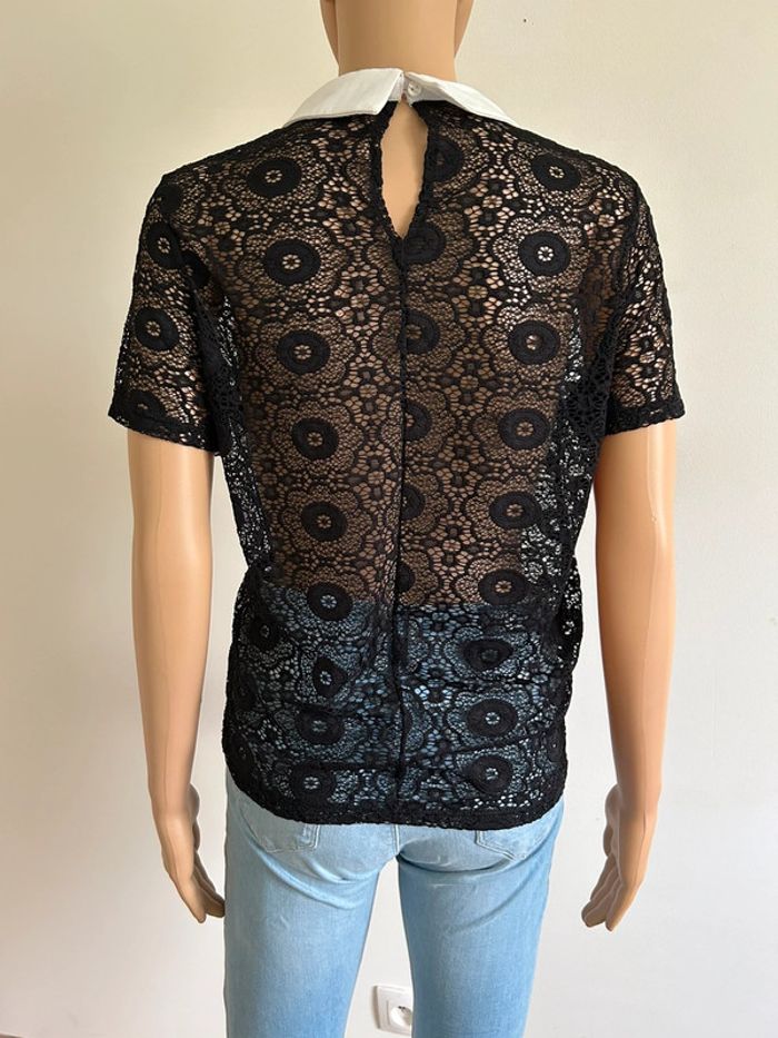 Joli haut noir transparent en dentelle, à manches courtes, avec col Claudine blanc, de marque Morgan.
