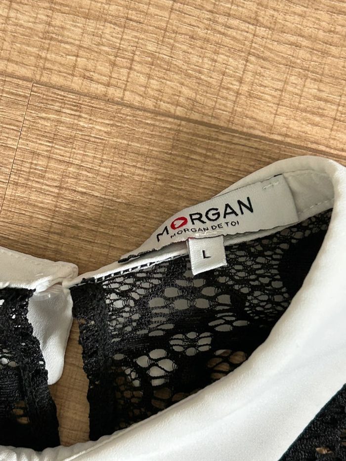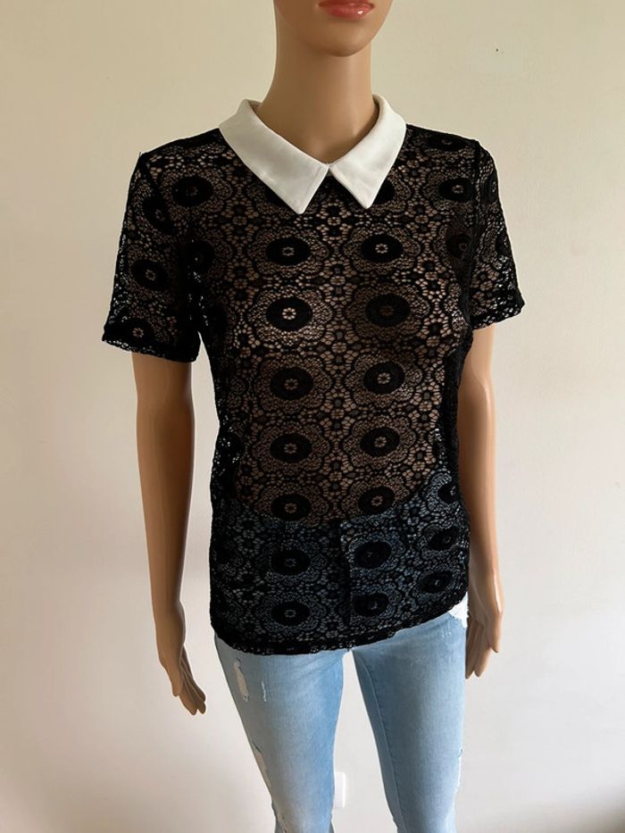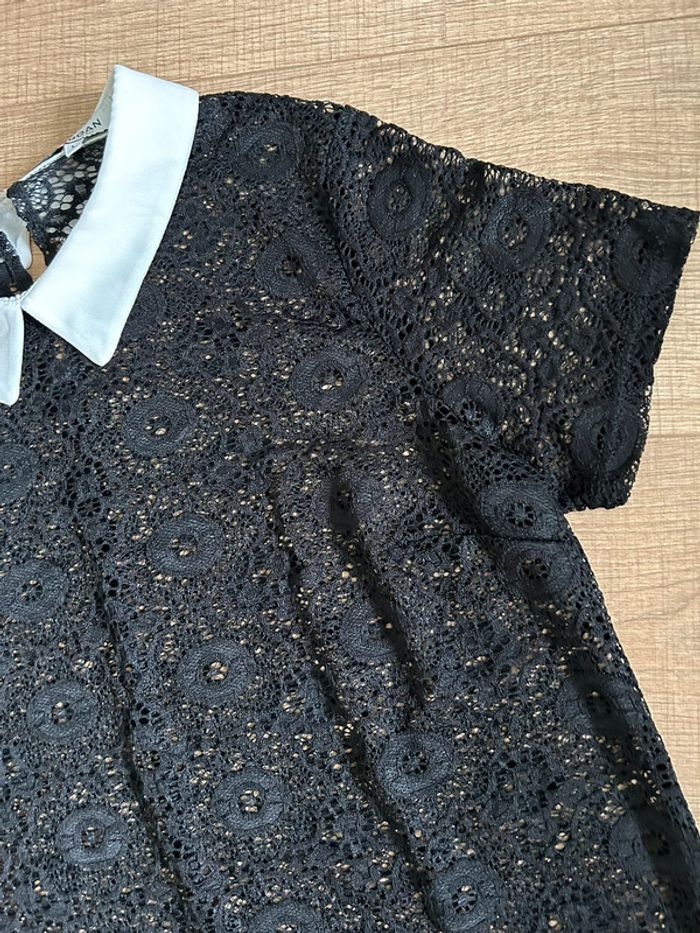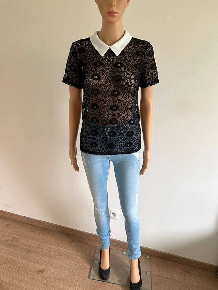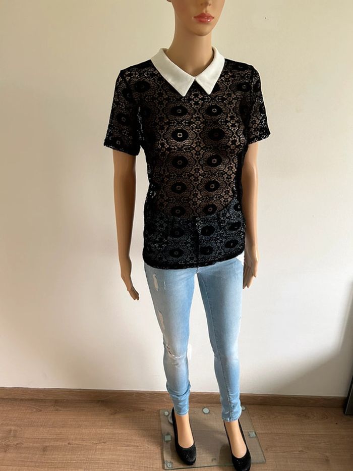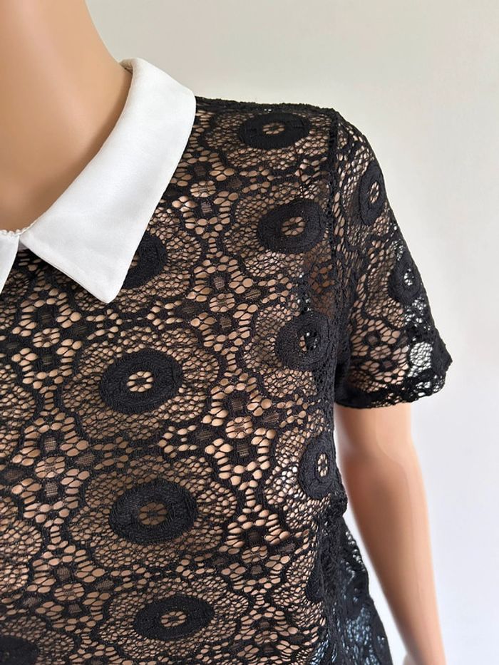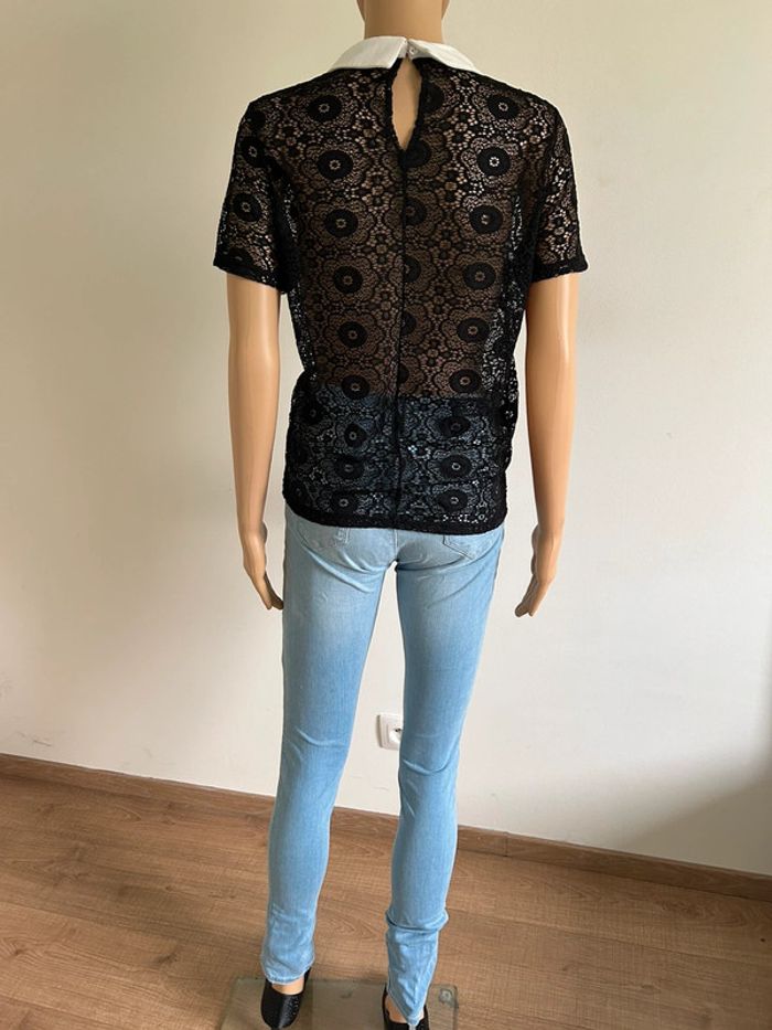 Joli haut noir transparent en dentelle, à manches courtes, avec col Claudine blanc, de marque Morgan.