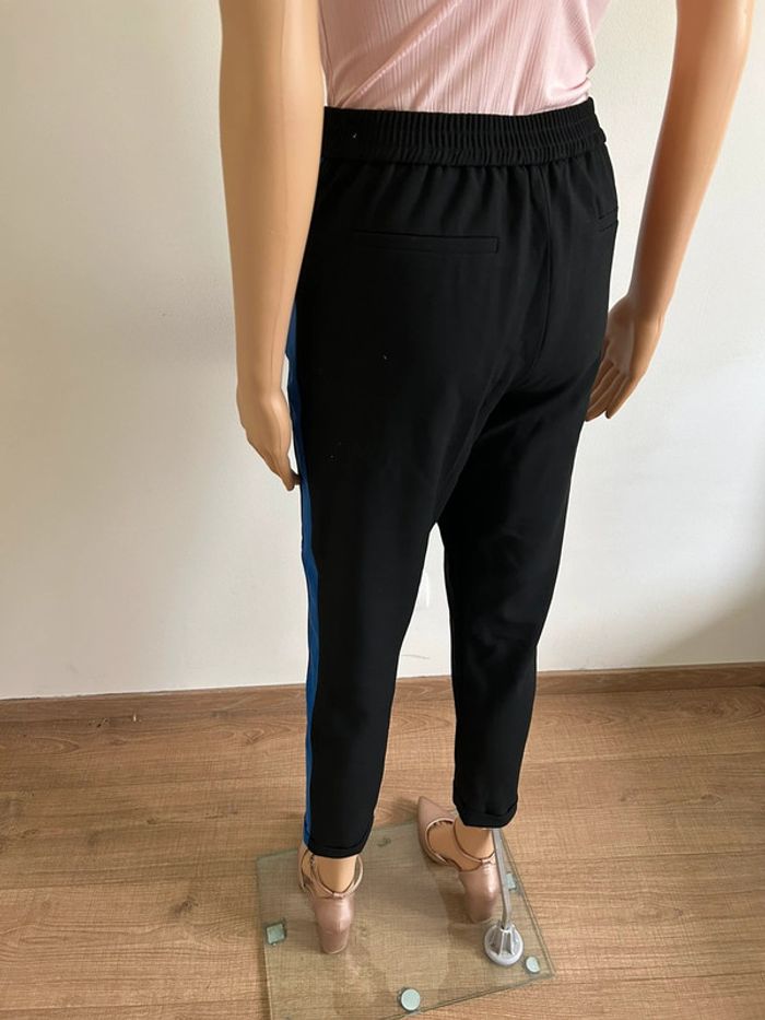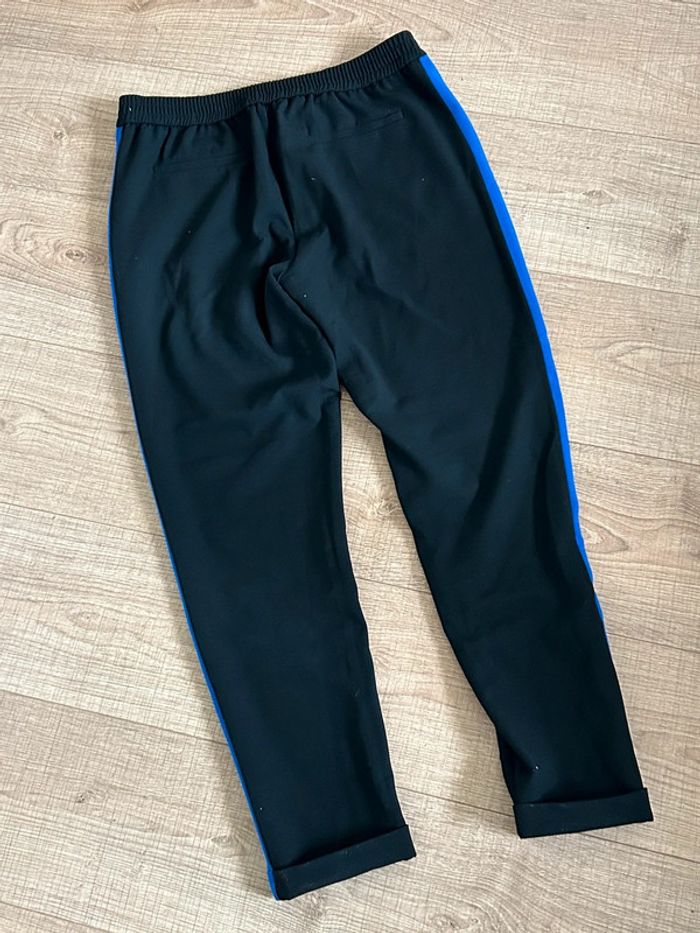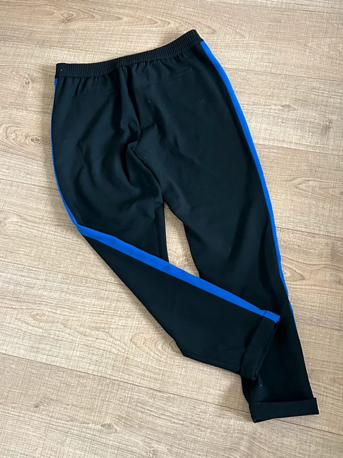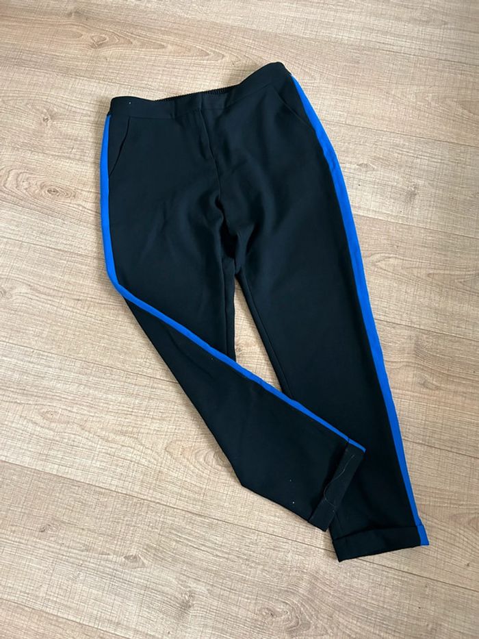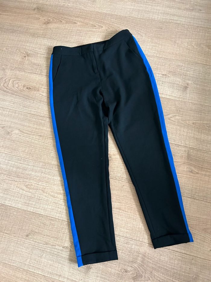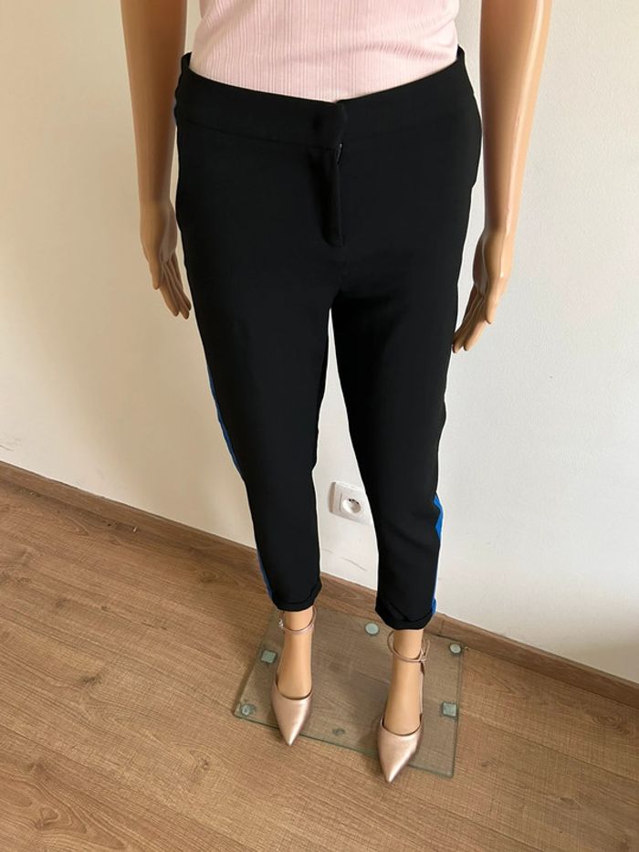 Joli pantalon noir avec bandes bleues sur les côtés, de marque Morgan. Taille 38. Jamais porté, état neuf. taille 37 cms à 45 cms longueur 91 cms longueur entrejambes 66 cms La taille est extensible 65% polyester, 31% viscose et 4% elasthanne Le prix reste négociable dans la limite du raisonnable. Un petit cadeau dans le colis 🌸