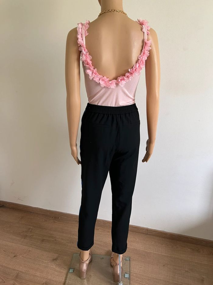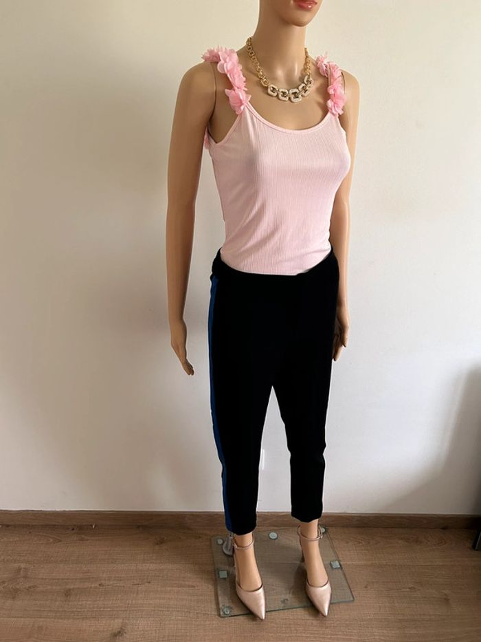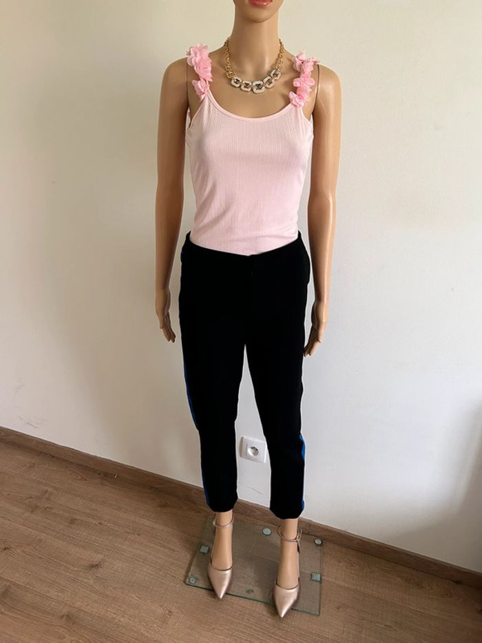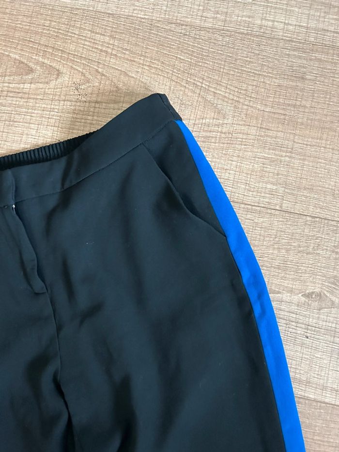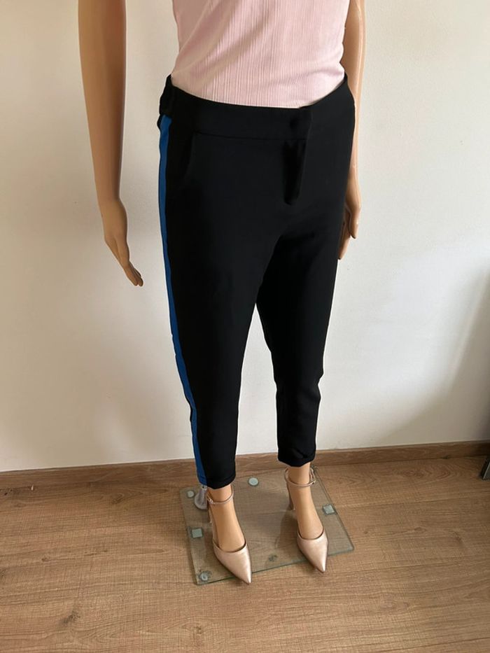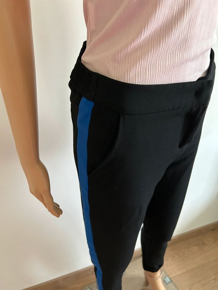 Joli pantalon noir avec bandes bleues sur les côtés, de marque Morgan. Taille 38. Jamais porté, état neuf. taille 37 cms à 45 cms longueur 91 cms longueur entrejambes 66 cms La taille est extensible 65% polyester, 31% viscose et 4% elasthanne Le prix reste négociable dans la limite du raisonnable. Un petit cadeau dans le colis 🌸