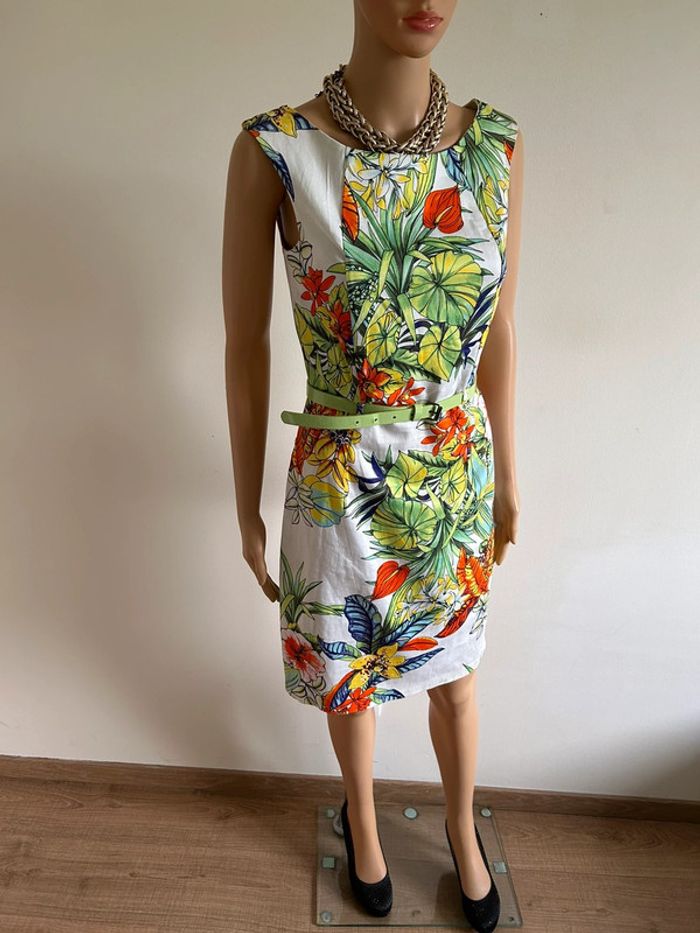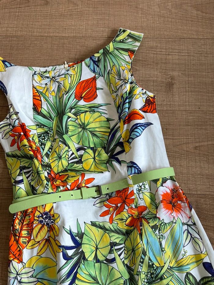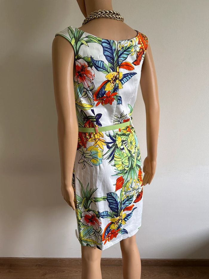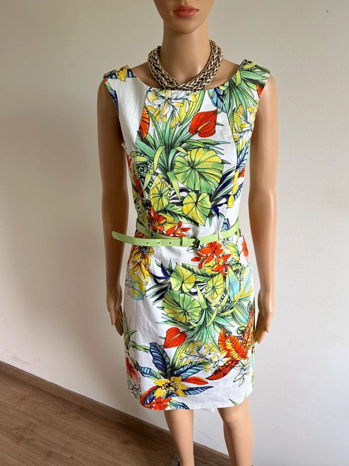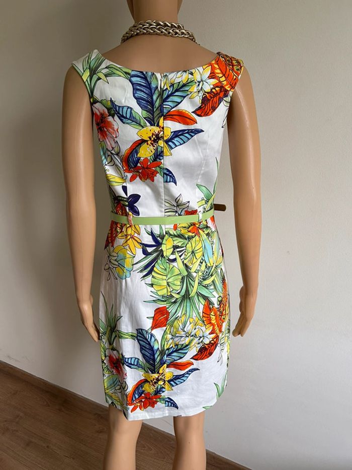 Magnifique robe blanche et fleurie sans manches, de marque LolaLiza. Fermeture dans le dos et petite ceinture verte en vinyle. Taille 34. Jamais portée, état neuf. aisselle à aisselle 42 cms taille 35 cms longueur depuis épaule 90 cms 97% coton et 3% elasthanne Le prix reste négociable dans la limite du raisonnable. Un petit cadeau dans le colis 🌸 (Boîte 12)
