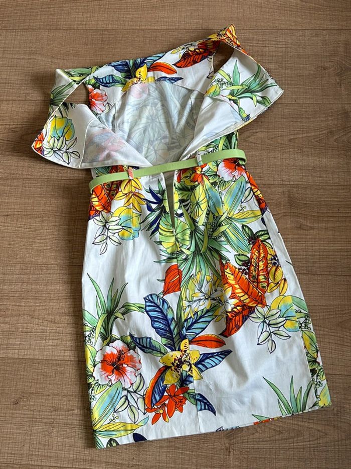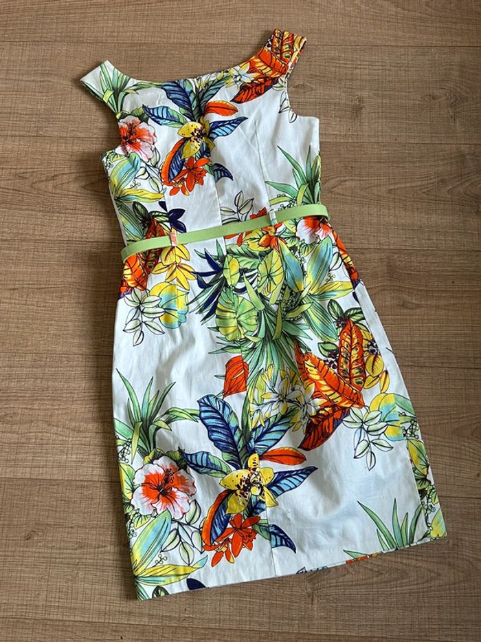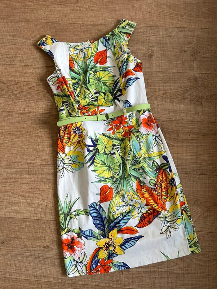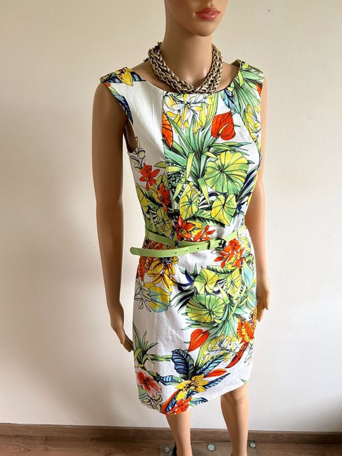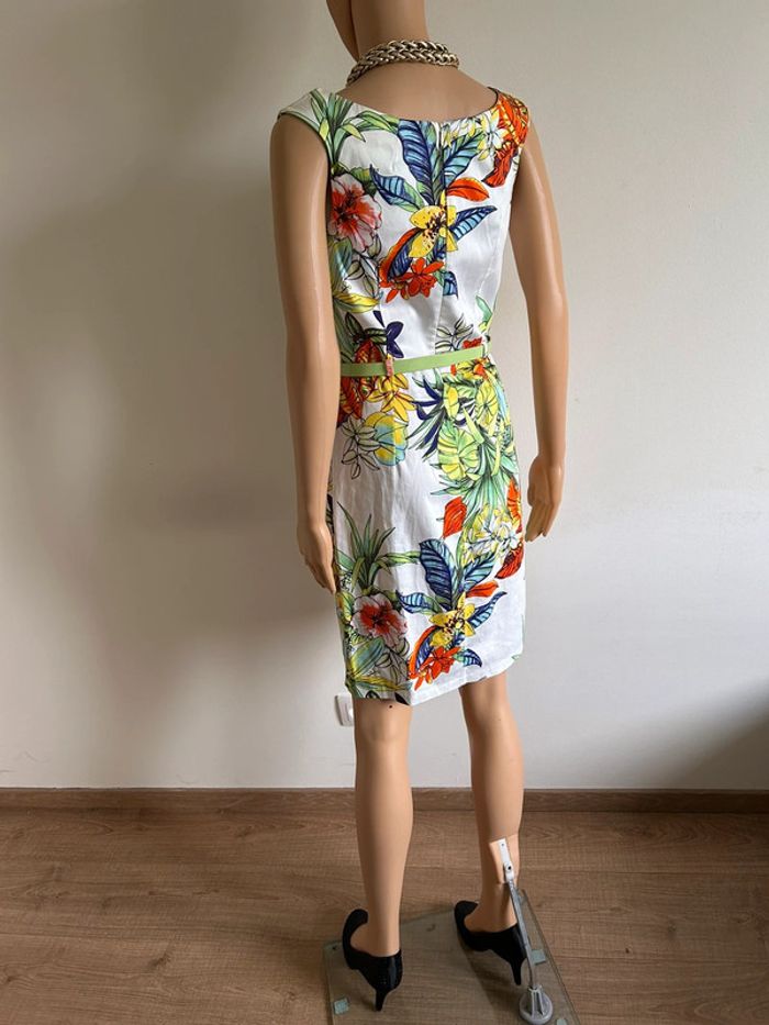 Magnifique robe blanche et fleurie sans manches, de marque LolaLiza. Fermeture dans le dos et petite ceinture verte en vinyle. Taille 34. Jamais portée, état neuf. aisselle à aisselle 42 cms taille 35 cms longueur depuis épaule 90 cms 97% coton et 3% elasthanne Le prix reste négociable dans la limite du raisonnable. Un petit cadeau dans le colis 🌸 (Boîte 12)