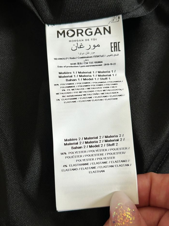 Magnifique robe noire et argentée sans manches, de marque Morgan. Taille 34. Elle est neuve avec étiquette (valeur 55€). aisselle à aisselle 37 cms à 42 cms taille 34 cms à 39 cms longueur depuis épaule 89 cms Le tissu est extensible 96% polyester et 4% elasthanne Le prix reste négociable dans la limite du raisonnable. Un petit cadeau dans le colis 🌸 (Boîte 49)