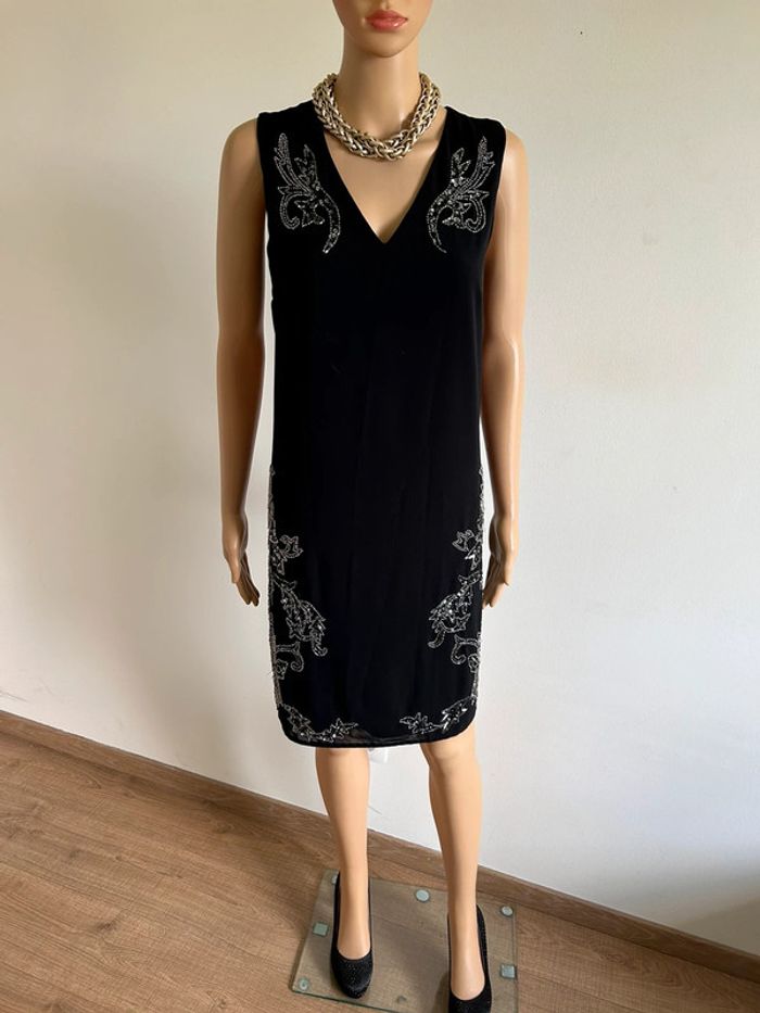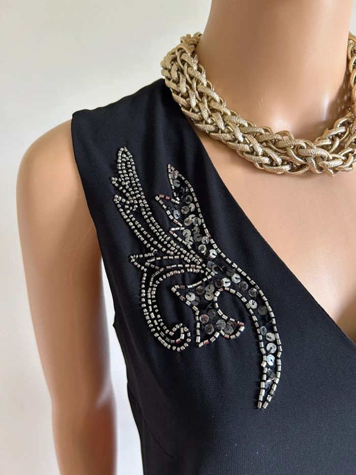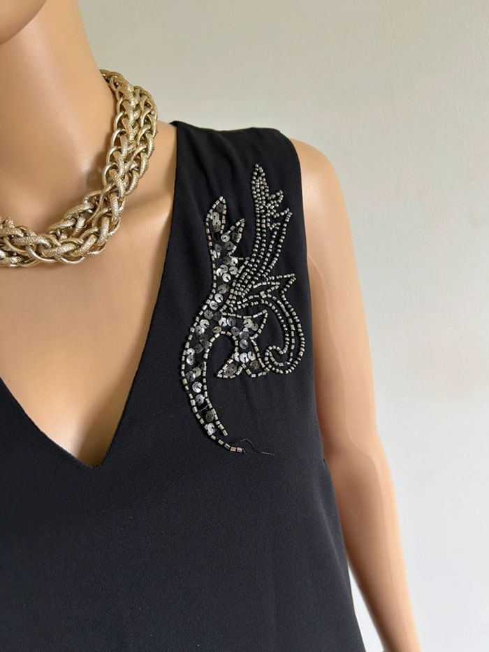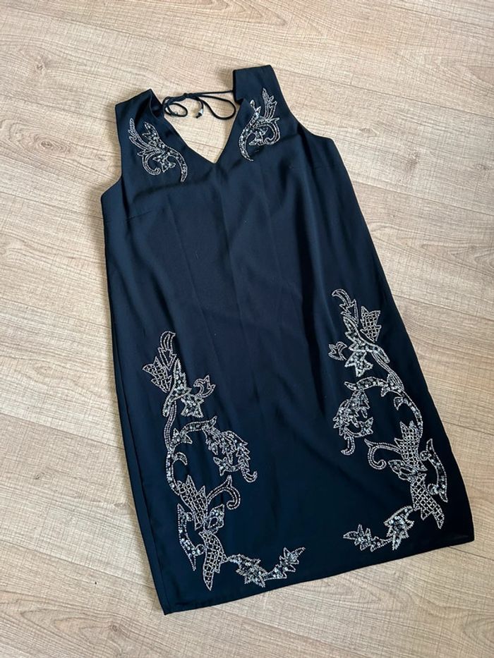 Jolie robe noire sans manches, avec perles et strass. Correspond à une taille 38 (étiquette intérieure coupée, voir mesures en dessous). Achetée chez Jacqueline Riu, mais plus d’étiquette de marque. aisselle à aisselle 46 cms taille 49 cms longueur depuis épaule 94 cms Étiquette intérieure de composition coupée Le prix reste négociable dans la limite du raisonnable. Un petit cadeau dans le colis 🌸 (Boîte 46)