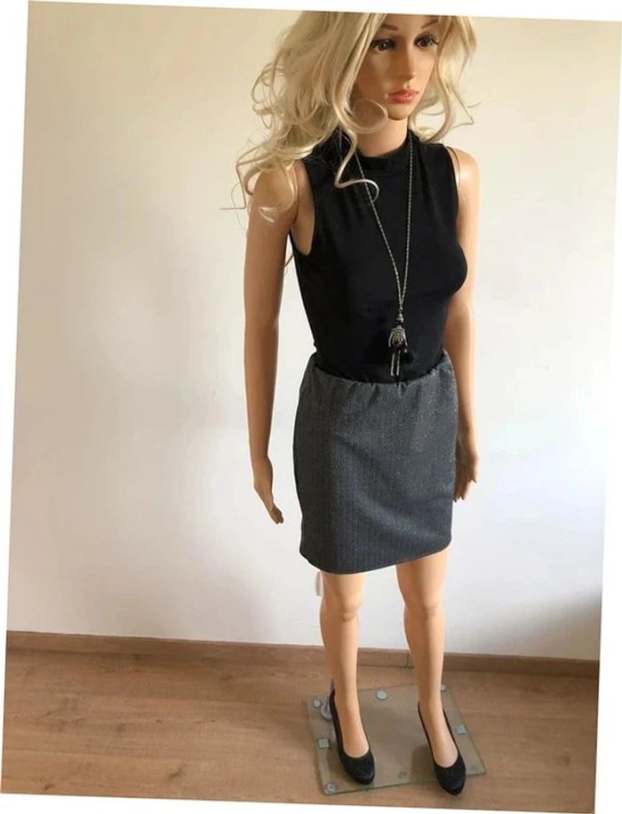 Jolie jupe grise argentée pailletée extensible. Taille L. Jamais portée, état neuf. taille 33 cms à 42 cms longueur 44 cms Le tissu est extensible 95% polyester et 5% elasthanne Le prix reste négociable dans la limite du raisonnable. Un petit cadeau dans le colis.