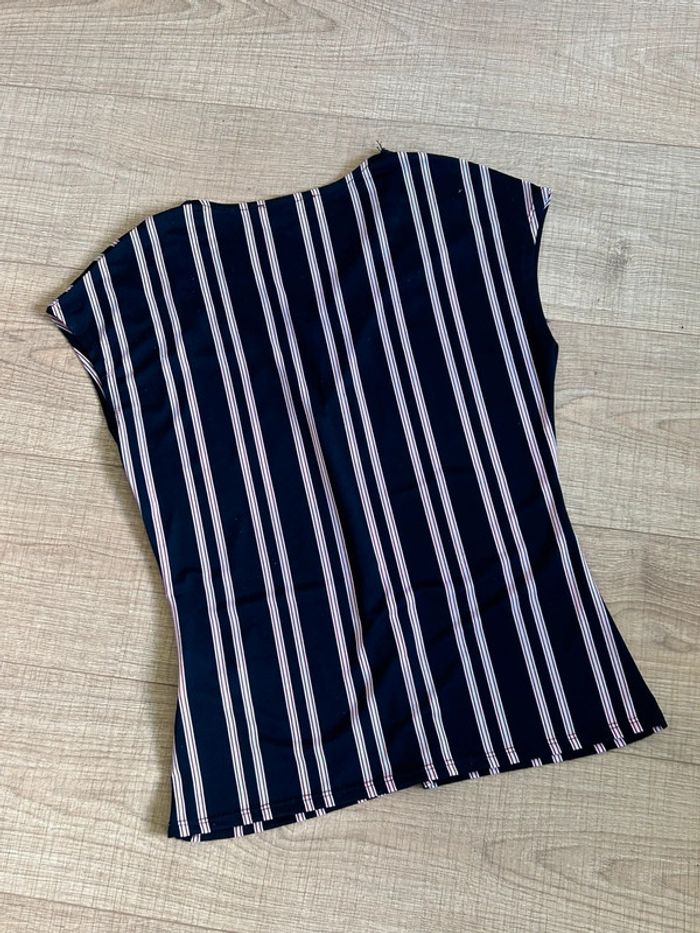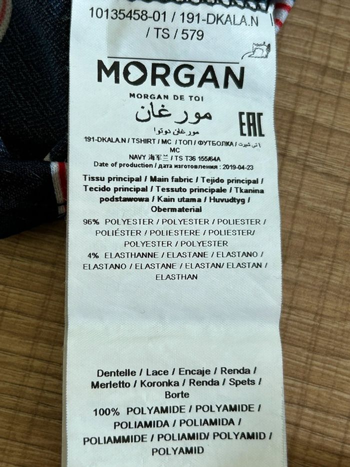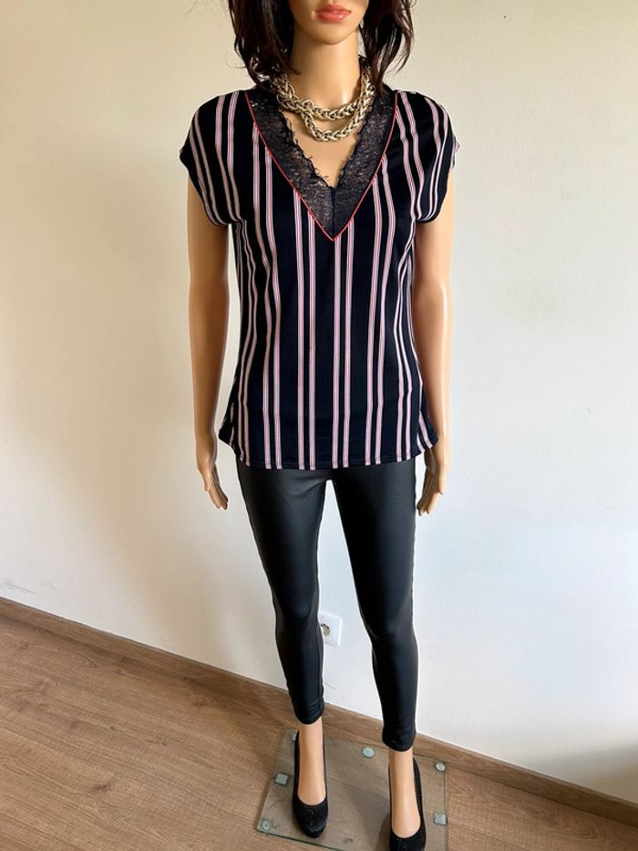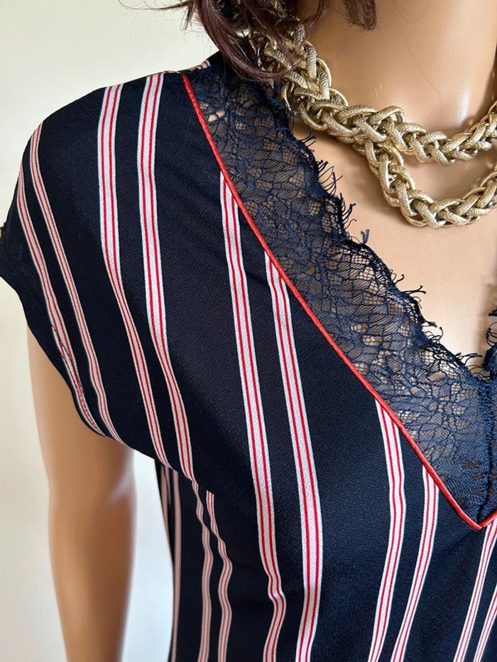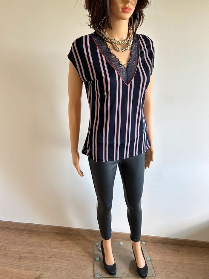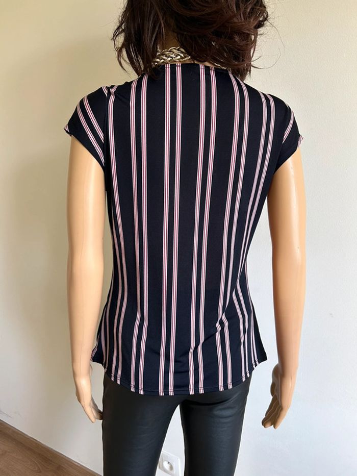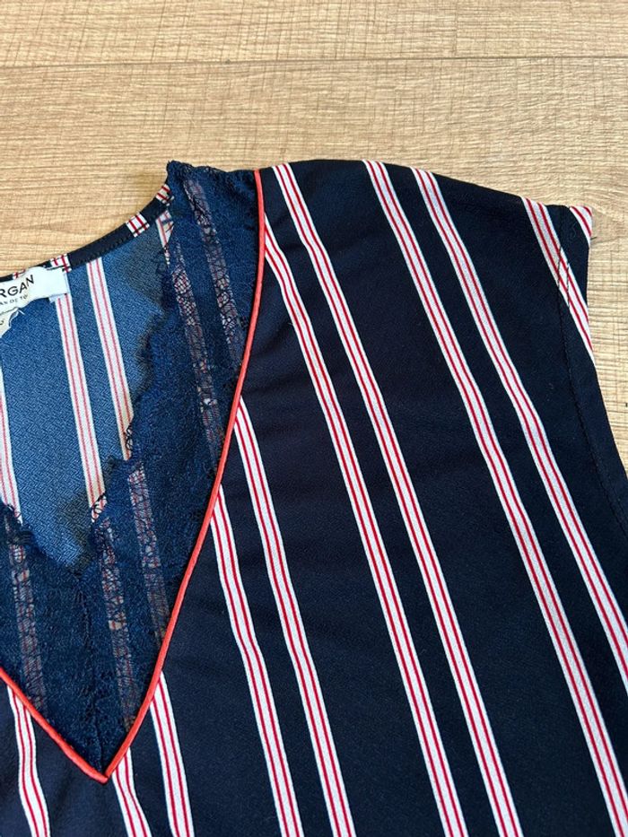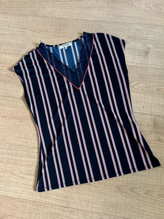 Jolie blouse rayée à manches courtes, avec dentelle, de marque Morgan. Taille S. Jamais portée, état neuf. aisselle à aisselle 44 cms et plus taille 39 cms et plus longueur depuis épaule 59 cms Le tissu est extensible 96% polyester et 4% elasthanne Le prix reste négociable dans la limite du raisonnable. Un petit cadeau dans le colis 🌸 (Boîte 2)