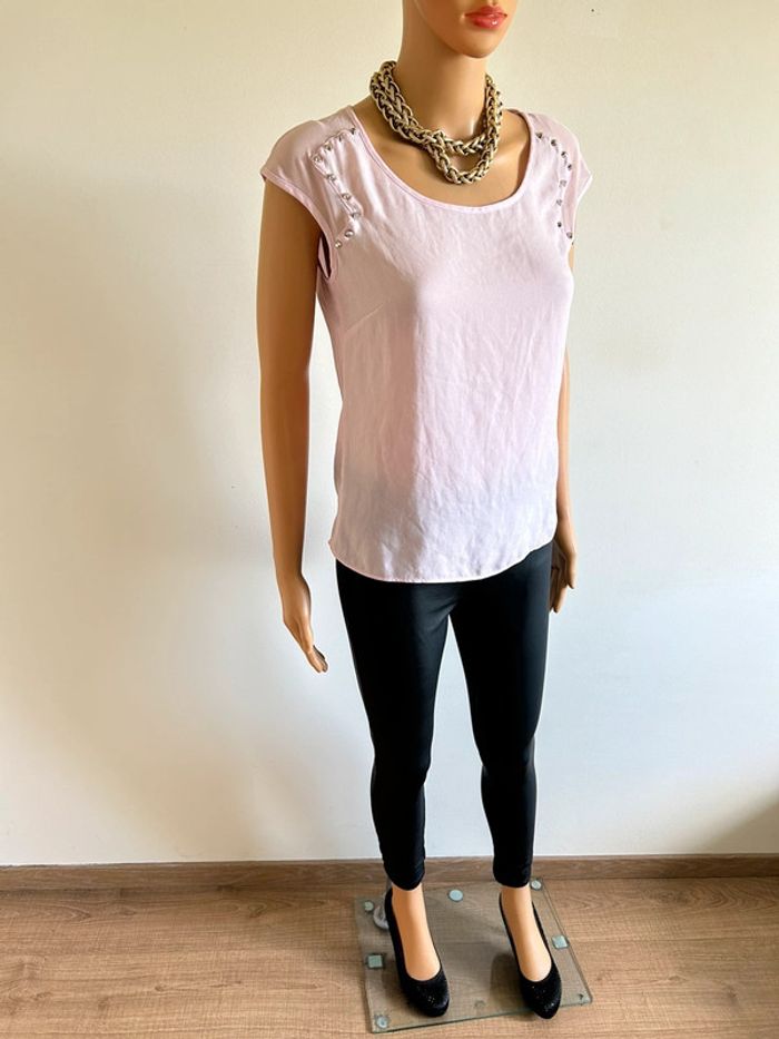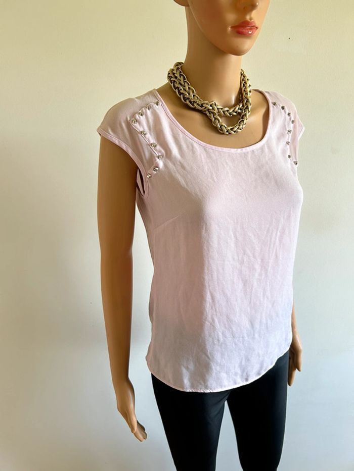 Jolie blouse rose claire à manches courtes, avec studs argentés au niveau des épaules, de marque Morgan. Taille 36. Peu portée, en excellent état. aisselle à aisselle 43 cms taille 42 cms longueur depuis épaule 56 cms Étiquette intérieure de composition coupée Le prix reste négociable dans la limite du raisonnable. Un petit cadeau dans le colis 🌸 (Boîte 2)