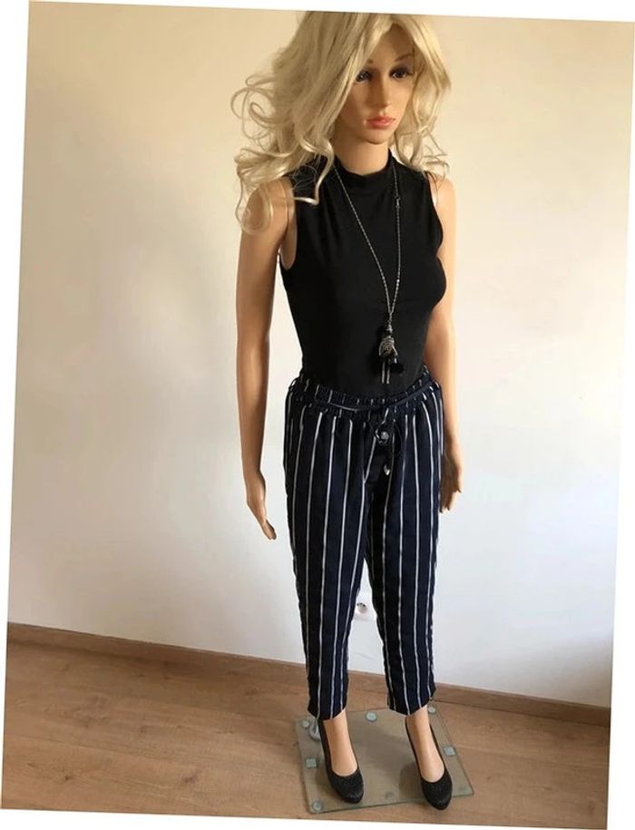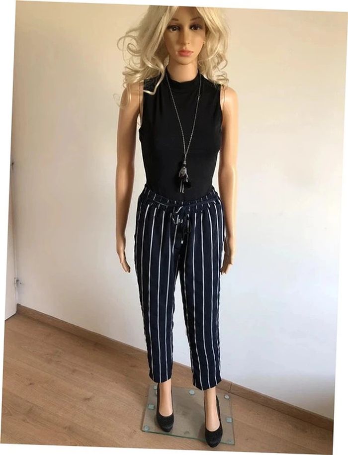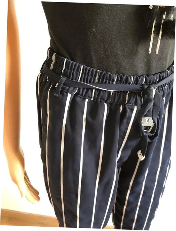 Joli pantalon fluide bleu marine et blanc à rayures de marque Mango. Taille S. Porté souvent, en bon état (la couleur blanche est un peu partie sur les parties en métal au niveau de la taille). taille 33 cms à 43 cms longueur 94 cms longueur entrejambes 69 cms La taille est extensible Étiquette intérieure de composition coupée Le prix reste négociable dans la limite du raisonnable.