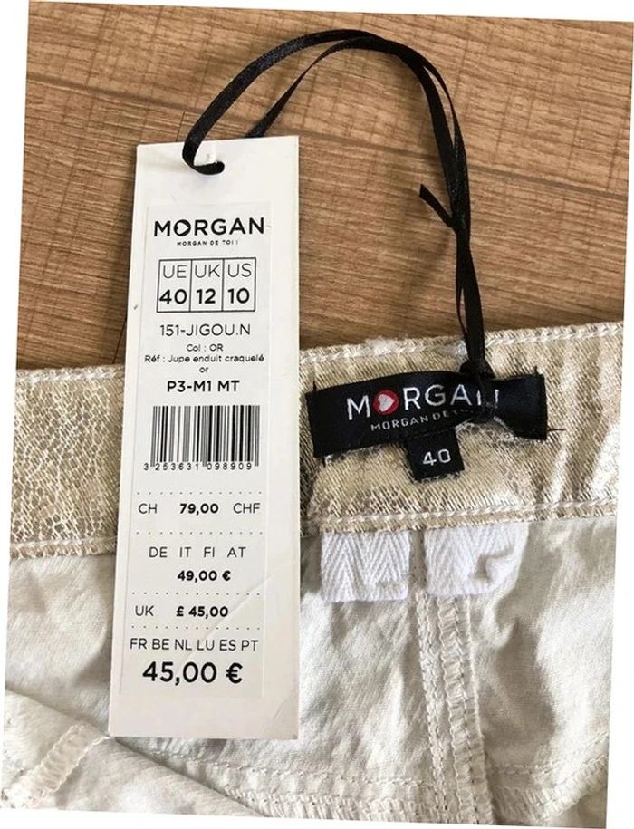 Jolie jupe dorée de marque Morgan. Taille 40. Elle est neuve avec étiquette (valeur 45€). taille 40 cms longueur 41 cms 100% coton Le prix reste négociable dans la limite du raisonnable. Un petit cadeau dans le colis.
