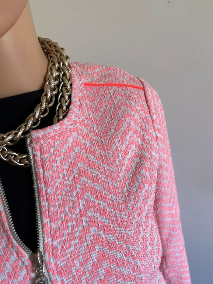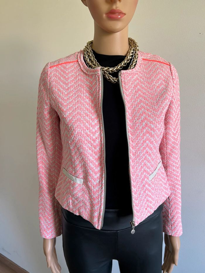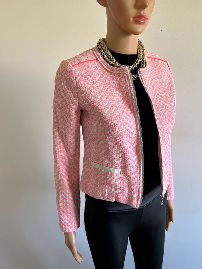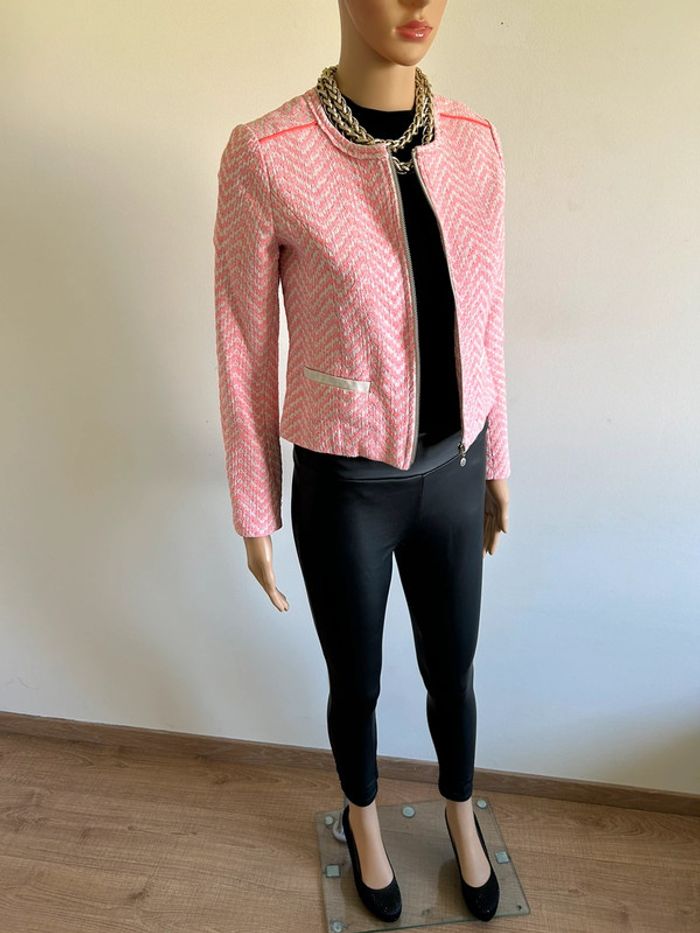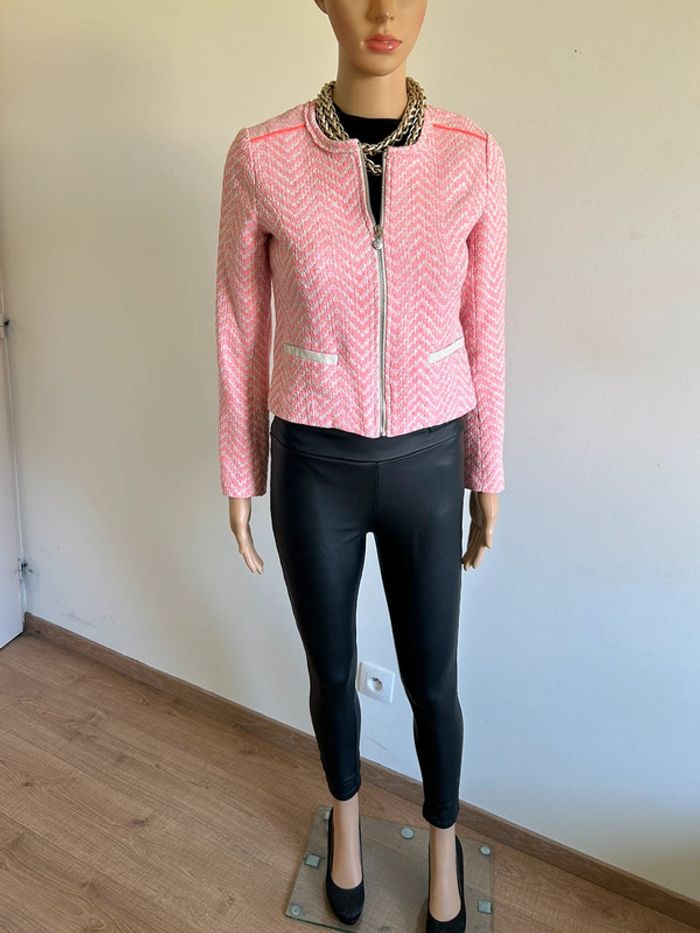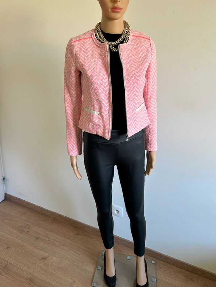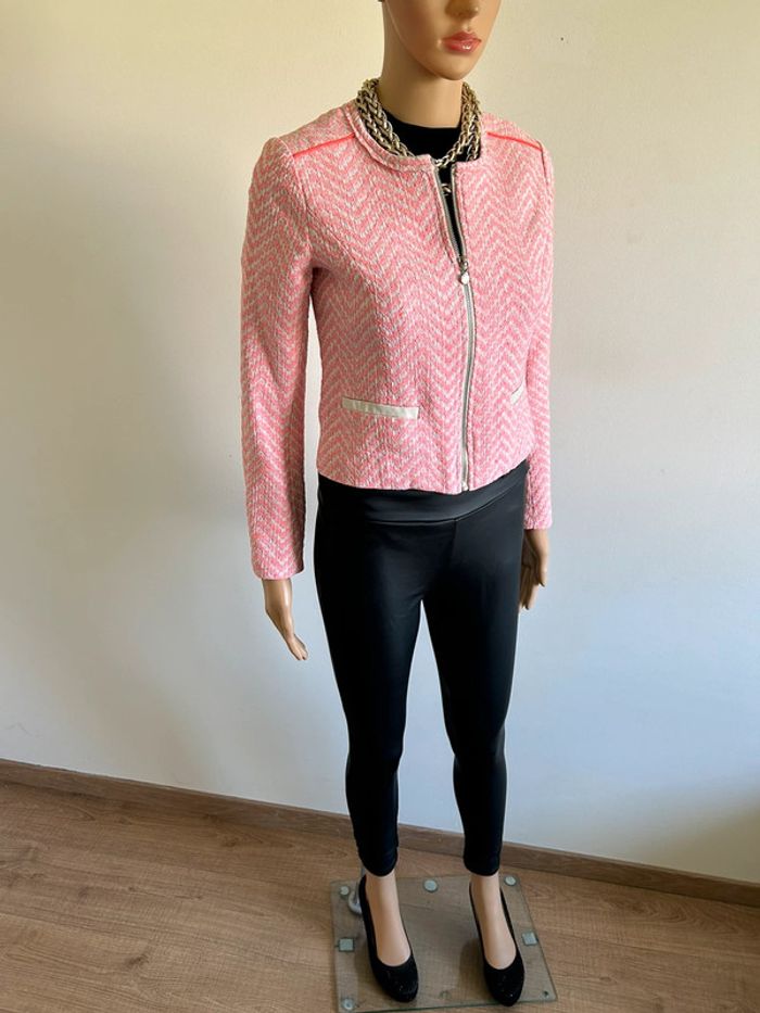 Magnifique veste rose et blanche, de marque Le Temps des Cerises. Taille XS. Portée une saison, en bon état. aisselle à aisselle 41 cms épaule à épaule 35 cms longueur manches 56 cms taille 38 cms longueur depuis épaule 47 cms 66% coton et 34% polyester Le prix reste négociable dans la limite du raisonnable. Un petit cadeau dans le colis 🌸