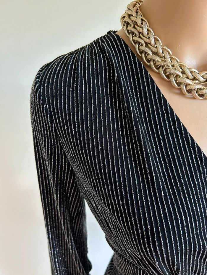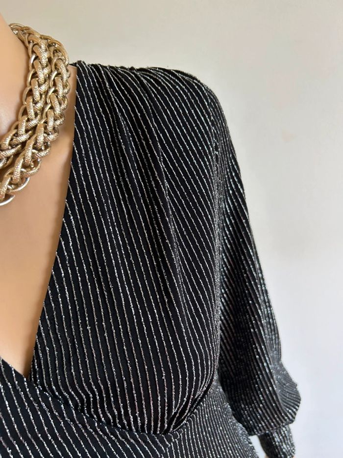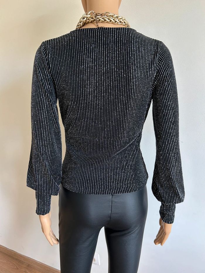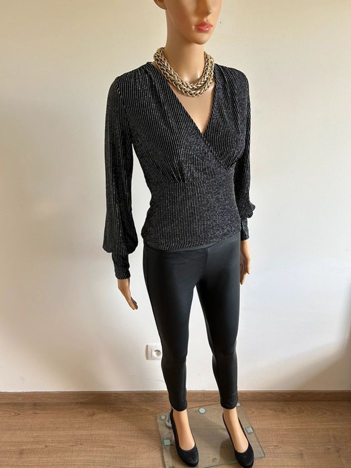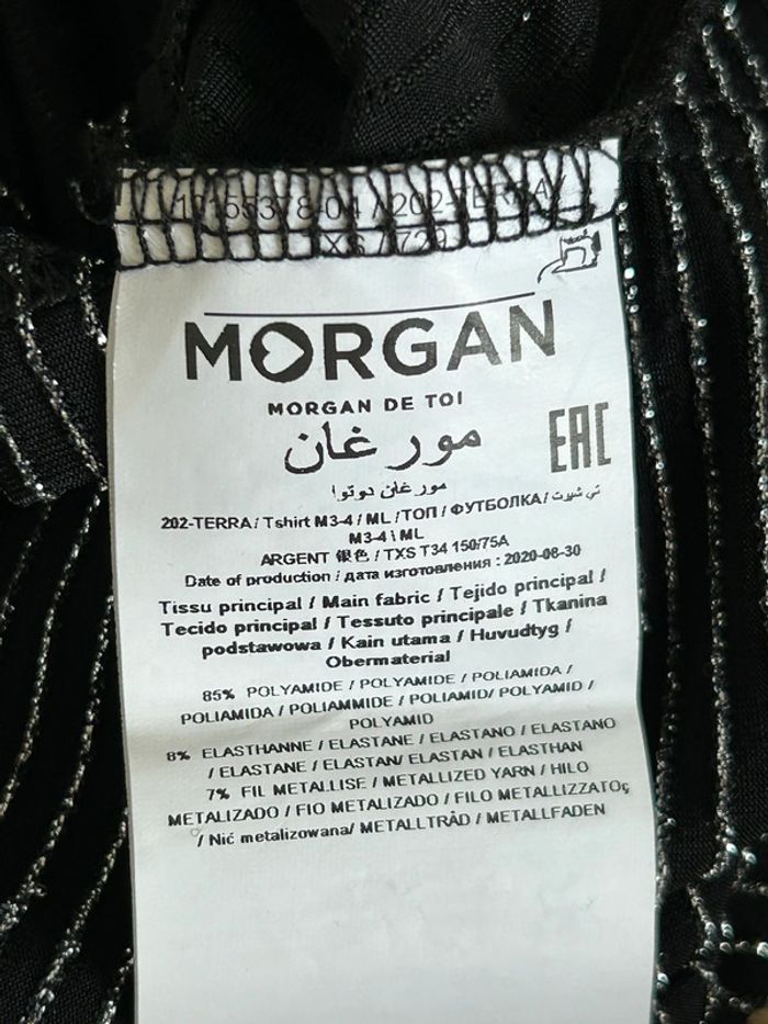 Magnifique blouse courte noire et argentée, à manches longues, de marque Morgan. Taille XS. Jamais portée, état neuf. aisselle à aisselle 40 cms et plus épaule à épaule 34 cms et plus longueur manches 60 cms taille 34 cms et plus longueur depuis épaule 49 cms Le tissu est extensible 85% polyamide, 8% elasthanne et 7% fil métallisé Le prix reste négociable dans la limite du raisonnable. Un petit cadeau dans le colis 🌸 (Boîte 3)