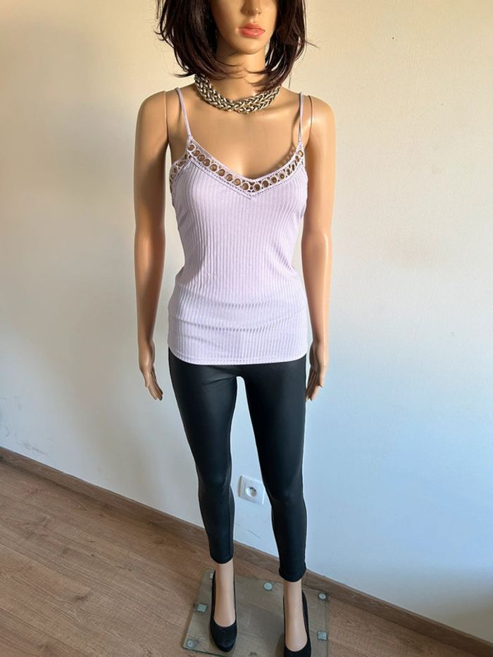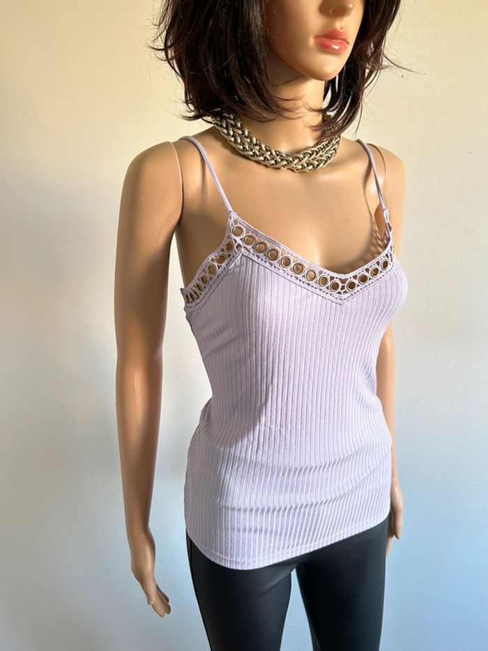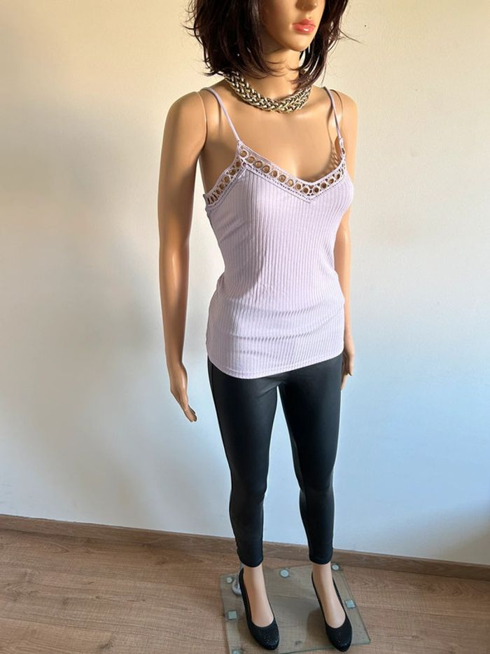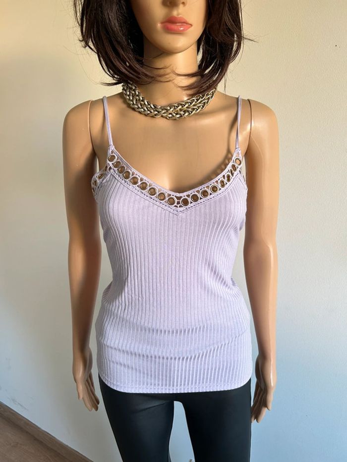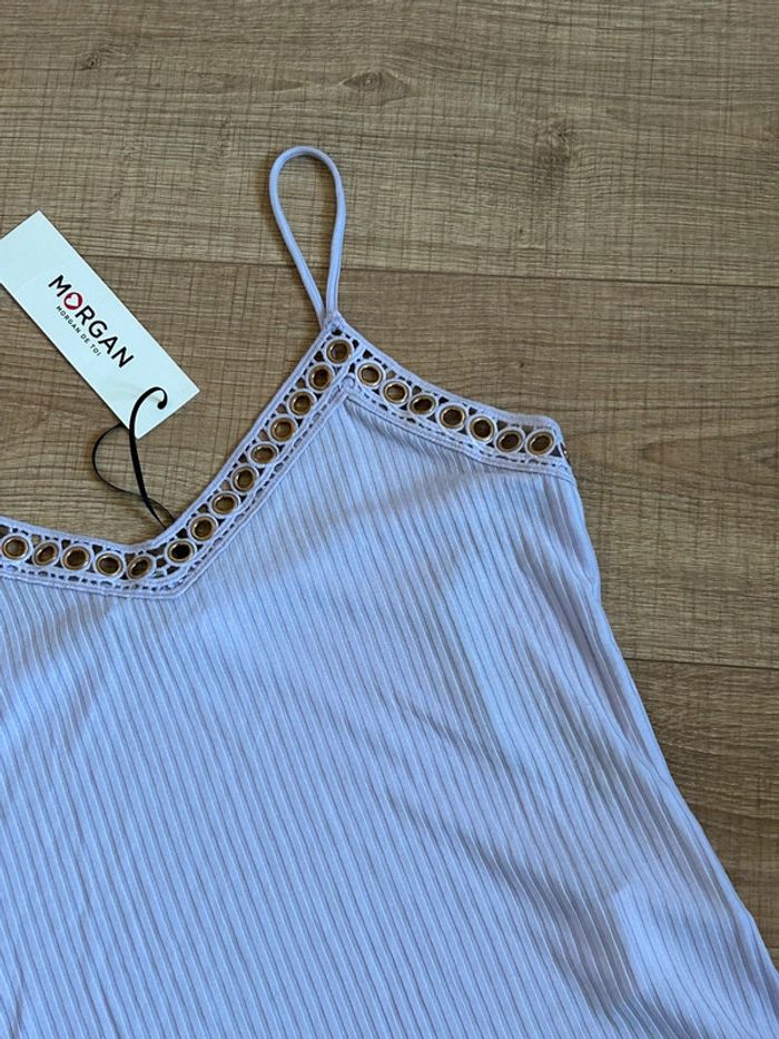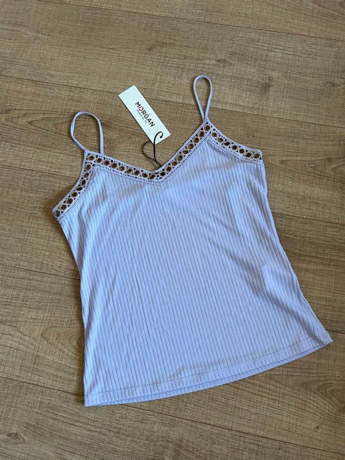 Joli débardeur lavande à bretelles, avec œillets, de marque Morgan. Taille L. Il est neuf avec étiquette. aisselle à aisselle 43 cms et plus taille 39 cms et plus longueur depuis épaule 58 cms Le tissu est extensible 70% modal et 30% polyester Le prix reste négociable dans la limite du raisonnable. Un petit cadeau dans le colis 🌸 (Boîte 1)