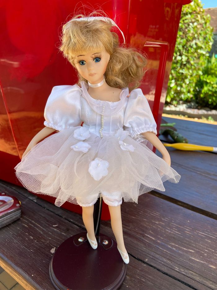 À vendre. Très belle poupée en porcelaine vendue avec son socle en bois. Taille: 30 cm (debout).