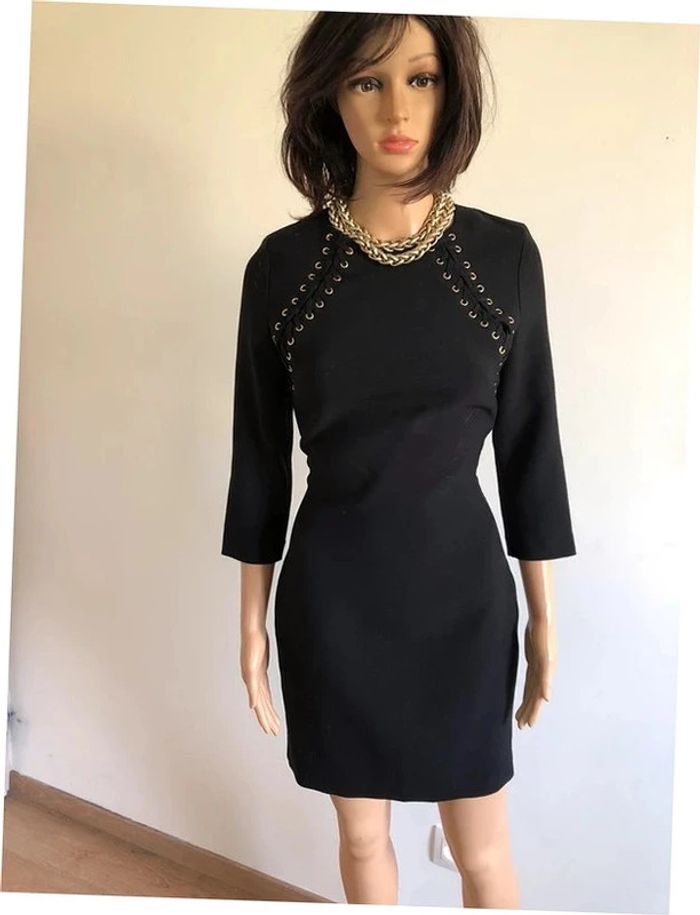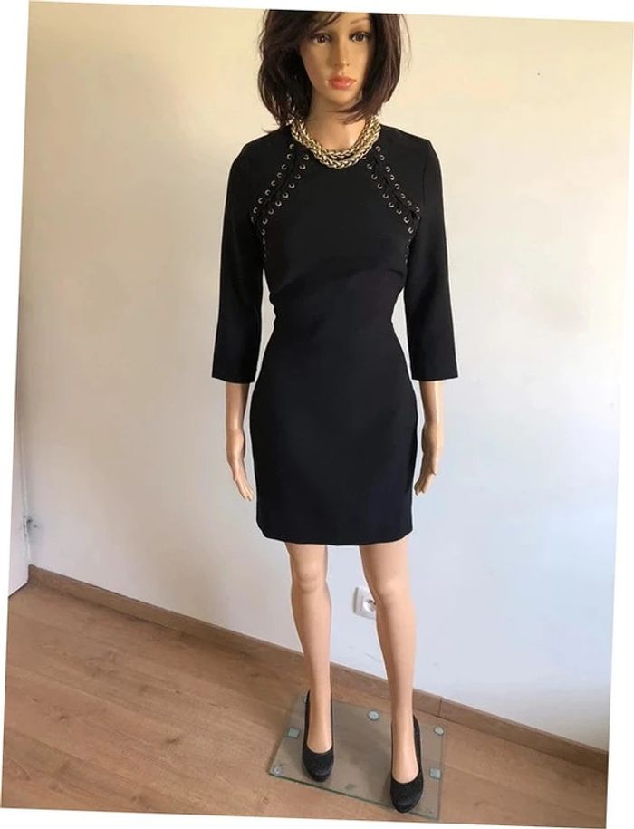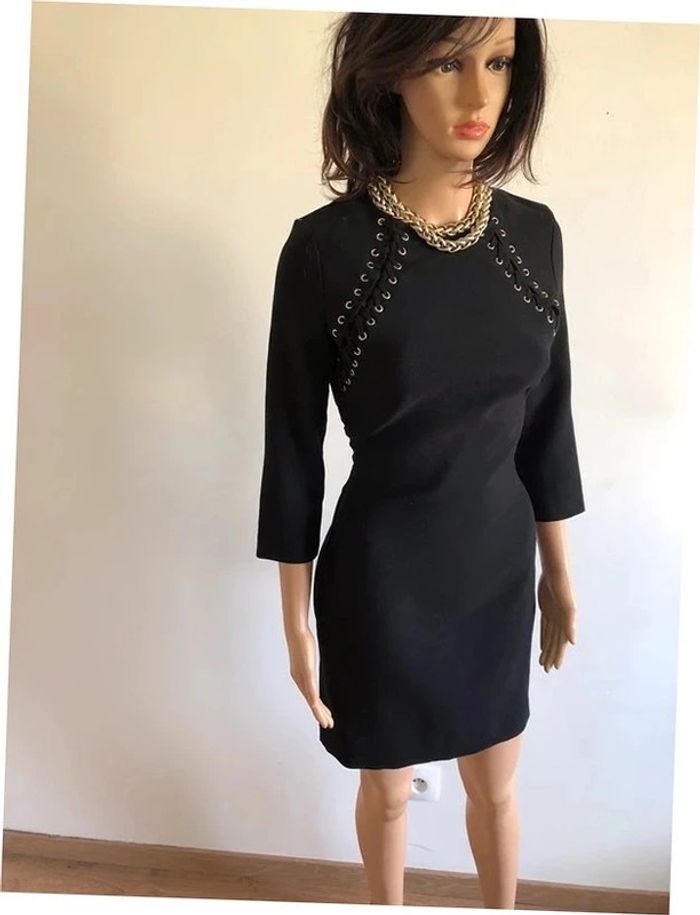 Magnifique robe noire avec œillets dorés, manches 3/4, de marque Morgan. Fermeture dans le dos. Taille XS. Jamais portée, état neuf. aisselle à aisselle 42 cms épaule à épaule 36 cms longueur manches 45 cms taille 34 cms longueur depuis épaule 89 cms 77 polyester, 18% viscose et 5% elasthanne Le prix reste négociable dans la limite du raisonnable. Un petit cadeau dans le colis. (Boîte 49)