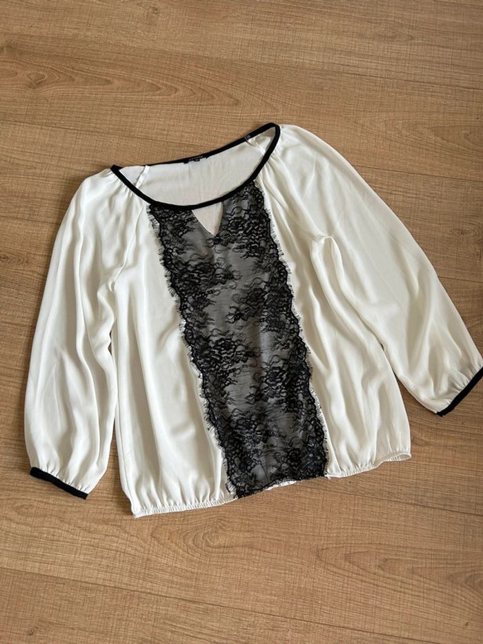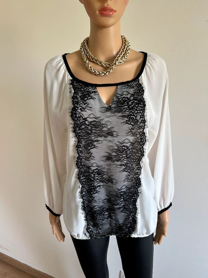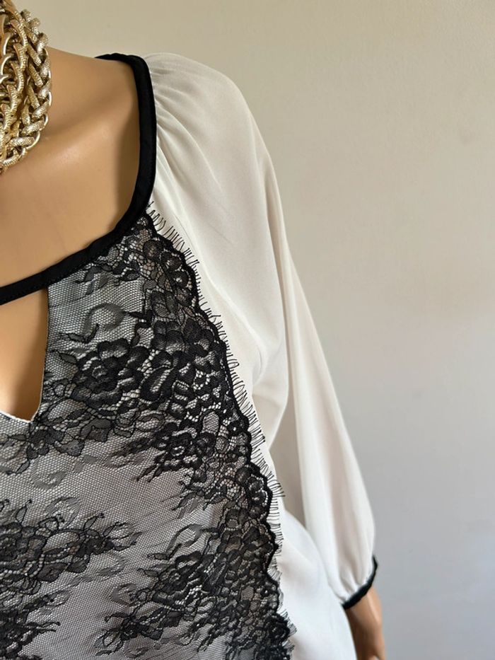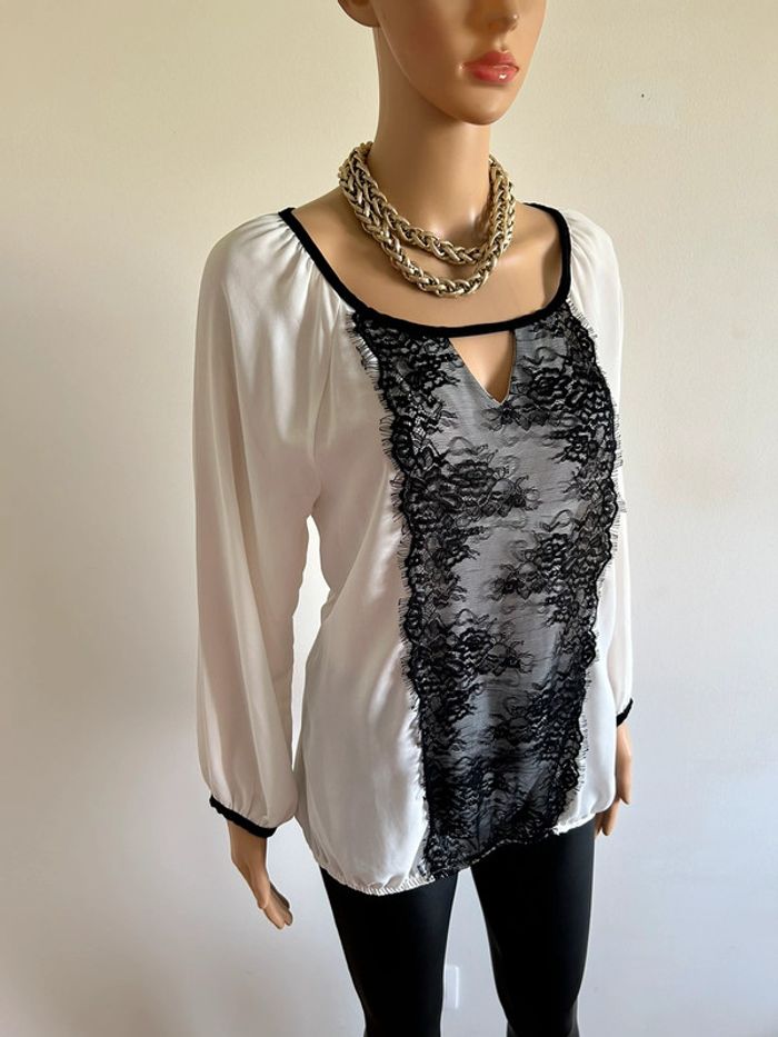 Jolie blouse blanche avec dentelle noire, à manches longues, de marque Morgan. Taille 40. Jamais portée, état neuf. aisselle à aisselle 45 cms taille 48 cms longueur depuis épaule 63 cms Étiquette intérieure de composition coupée Le prix reste négociable dans la limite du raisonnable. Un petit cadeau dans le colis 🌸 (Boîte 1)
