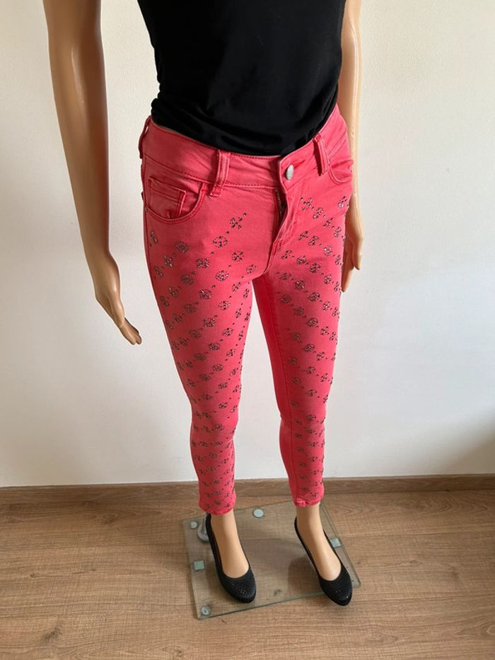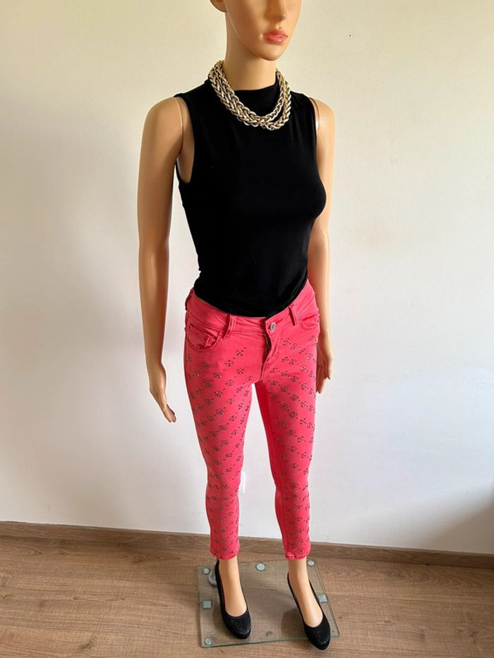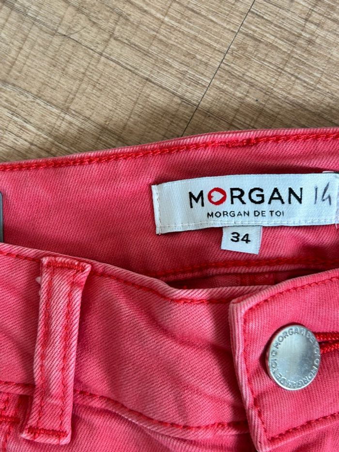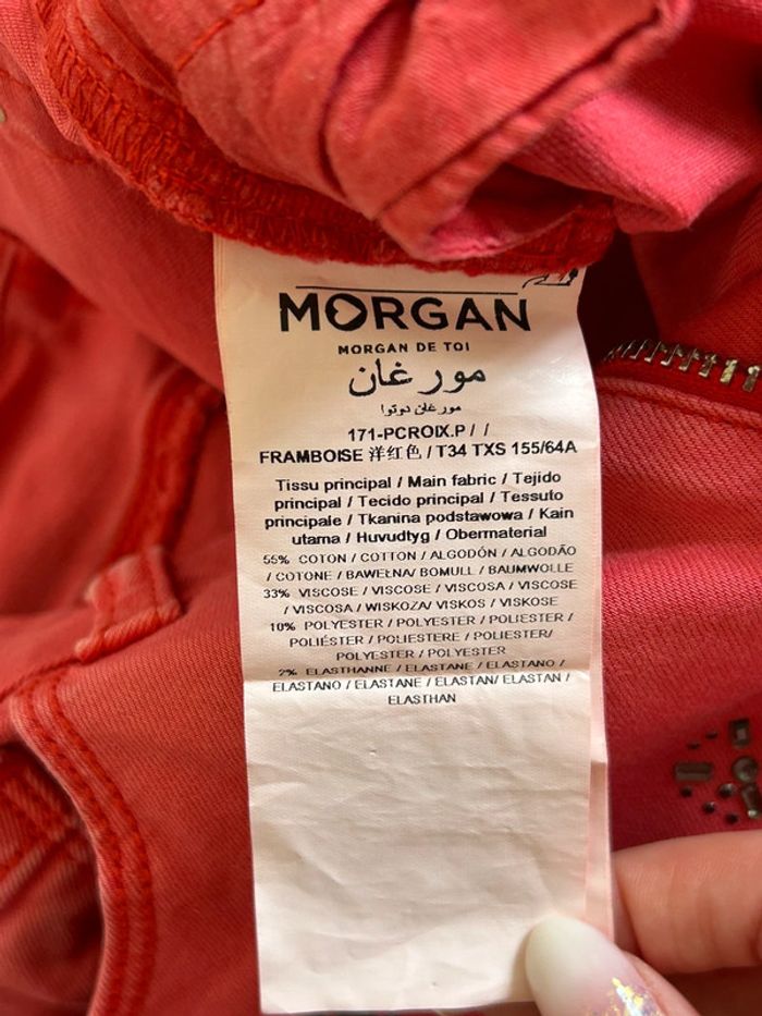 Joli jean rose avec strass, de marque Morgan. Taille 34. Peu porté, en très bon état. taille 30 cms à 35 cms longueur 90 cms longueur entrejambes 66 cms Le tissu est extensible 55% coton, 33% viscose, 10% polyester et 2% elasthanne Le prix reste négociable dans la limite du raisonnable. Un petit cadeau dans le colis 🌸