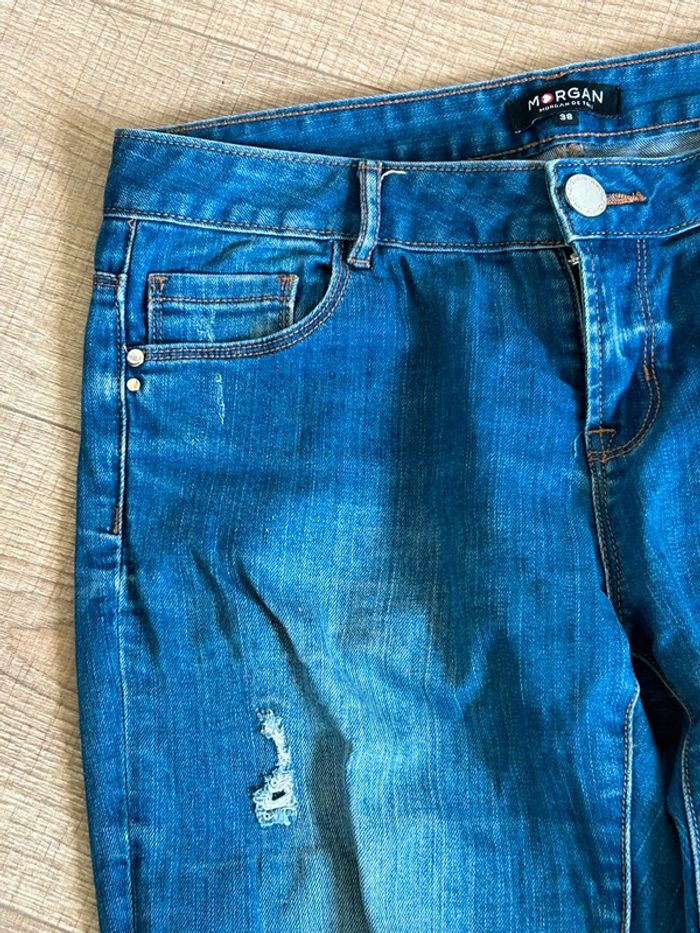 Jean bleu de marque Morgan. Taille 38. Porté quelques fois, en très bon état. taille 38 cms longueur 99 cms longueur entrejambes 78 cms 99% coton et 1% elasthanne Le prix reste négociable dans la limite du raisonnable. Un petit cadeau dans le colis 🌸