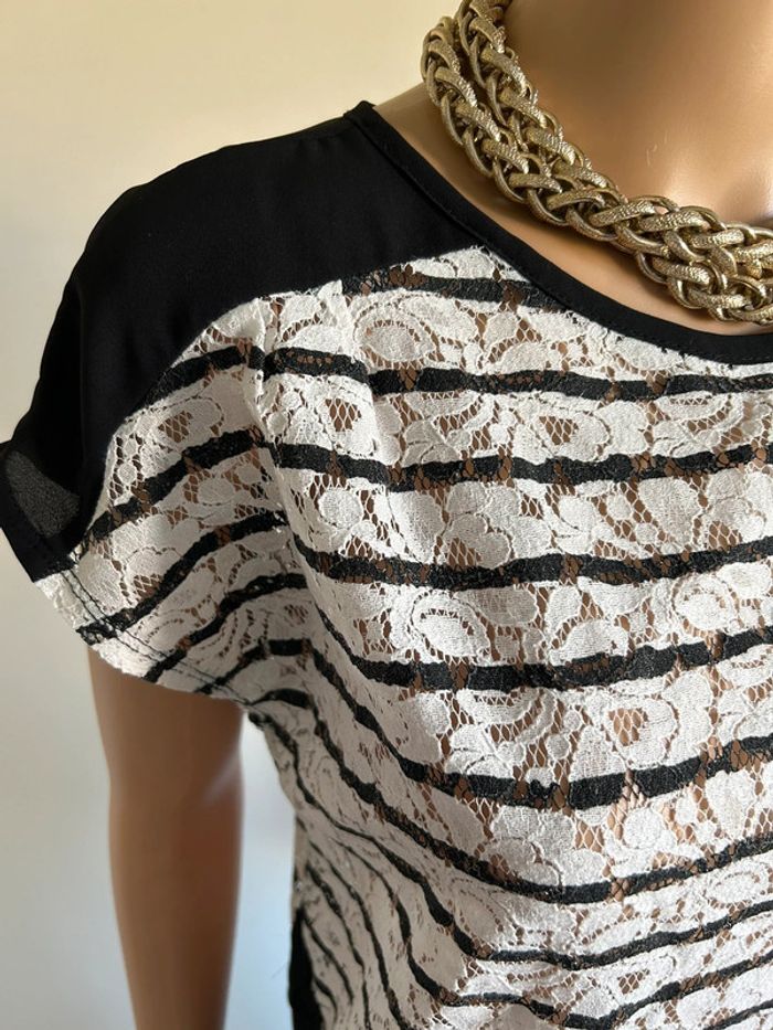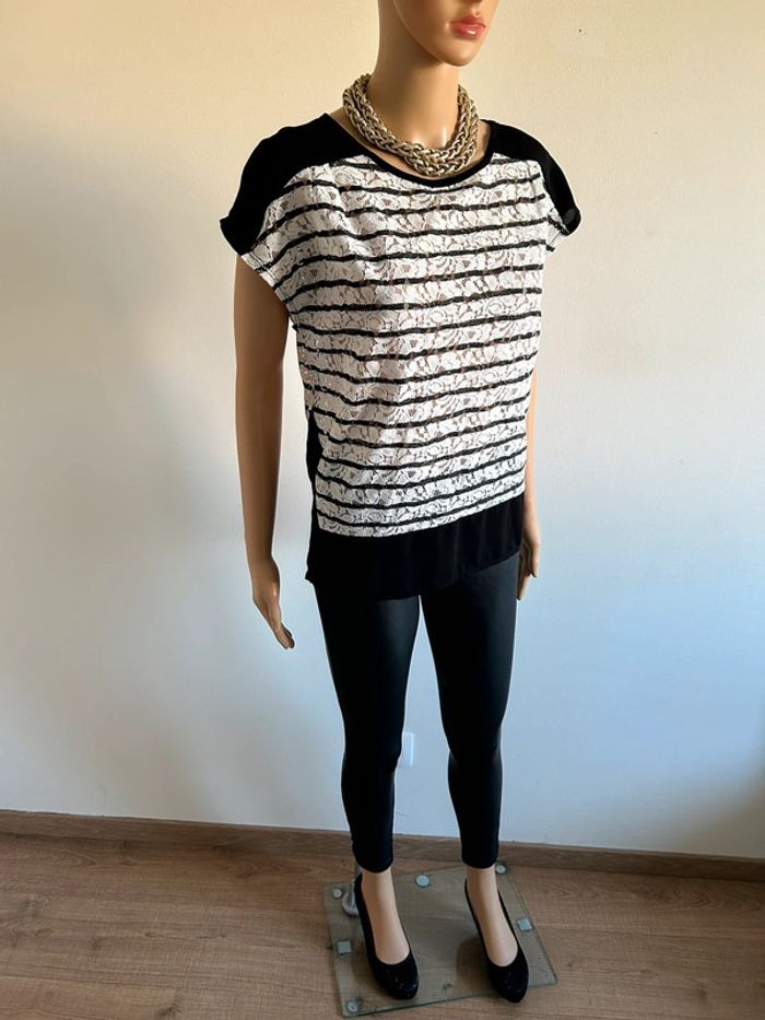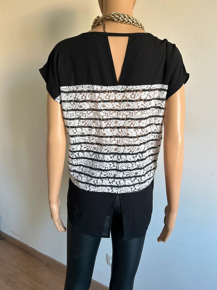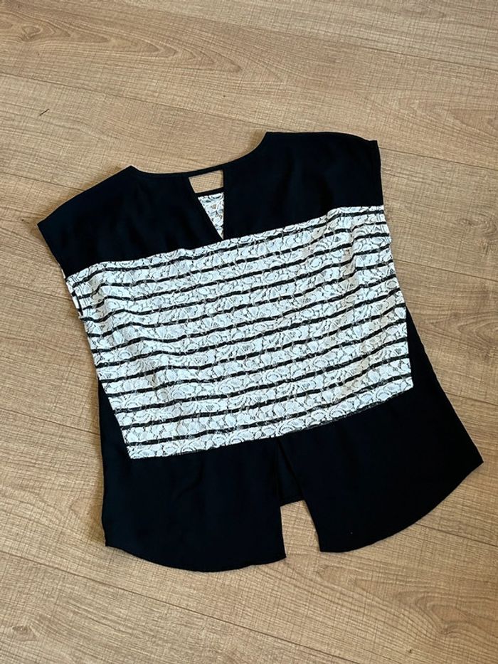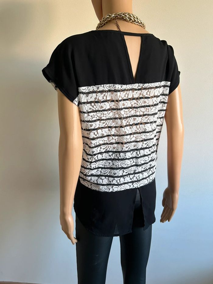 Blouse noire et blanche avec dentelle, à manches courtes, de marque Morgan. Taille 40. Jamais portée, état neuf. aisselle à aisselle 53 cms taille 49 cms longueur depuis épaule 60 cms à 68 cms Étiquette intérieure de composition coupée Le prix reste négociable dans la limite du raisonnable. Un petit cadeau dans le colis 🌸 (Boîte 1)