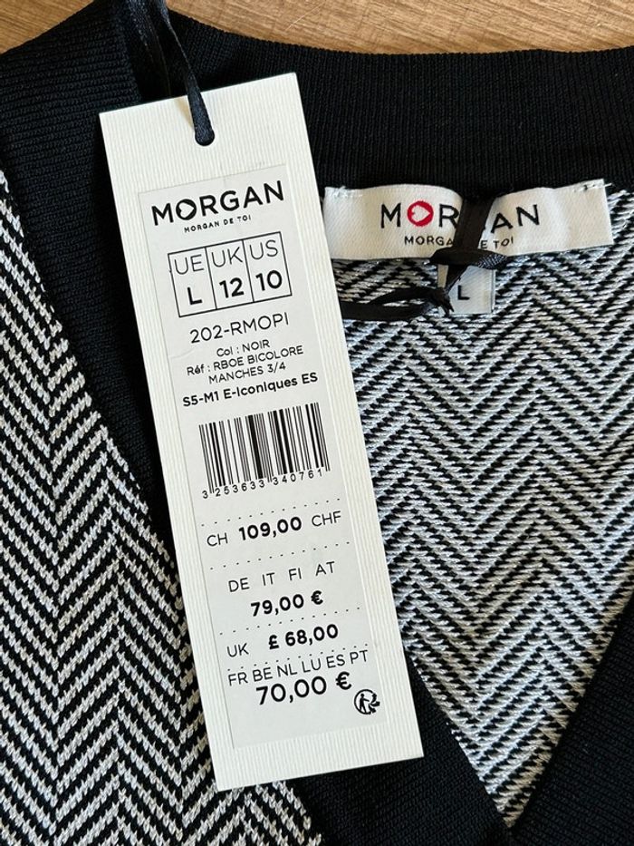 Jolie robe noire et beige dorée, de marque Morgan. Taille L. Elle est neuve avec étiquette (valeur 70€). aisselle à aisselle 45 cms et plus épaule à épaule 36 cms et plus taille 40 cms et plus longueur depuis épaule 91 cms Le tissu est extensible 50% viscose, 42% polyamide et 8% fil métallisé Le prix reste négociable dans la limite du raisonnable. Un petit cadeau dans le colis 🌸 (Boîte 17)