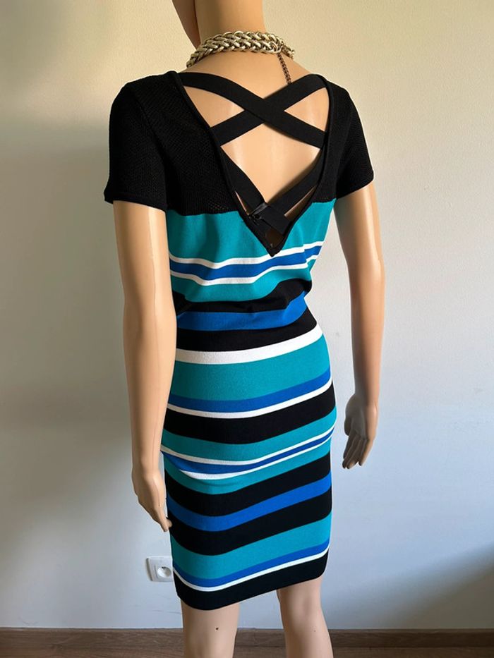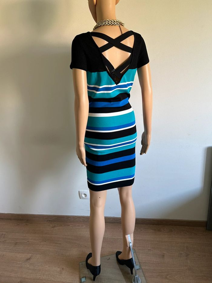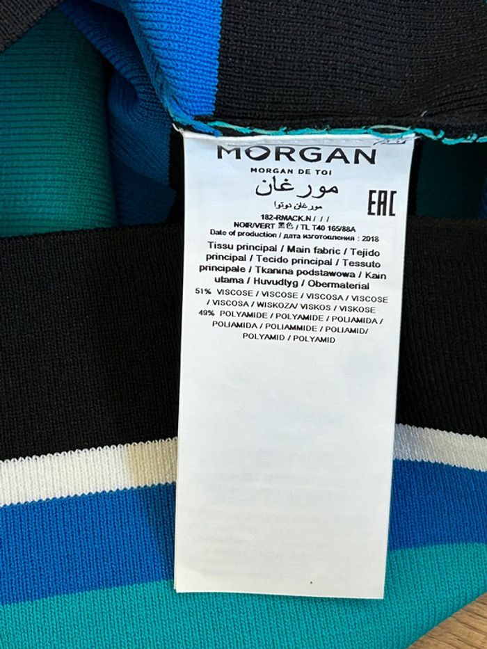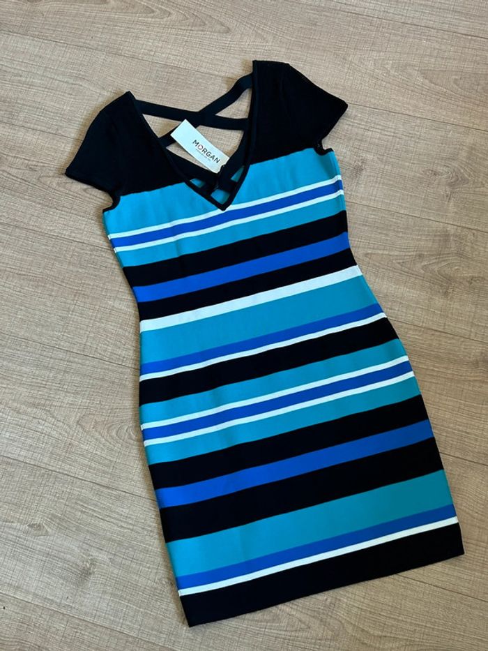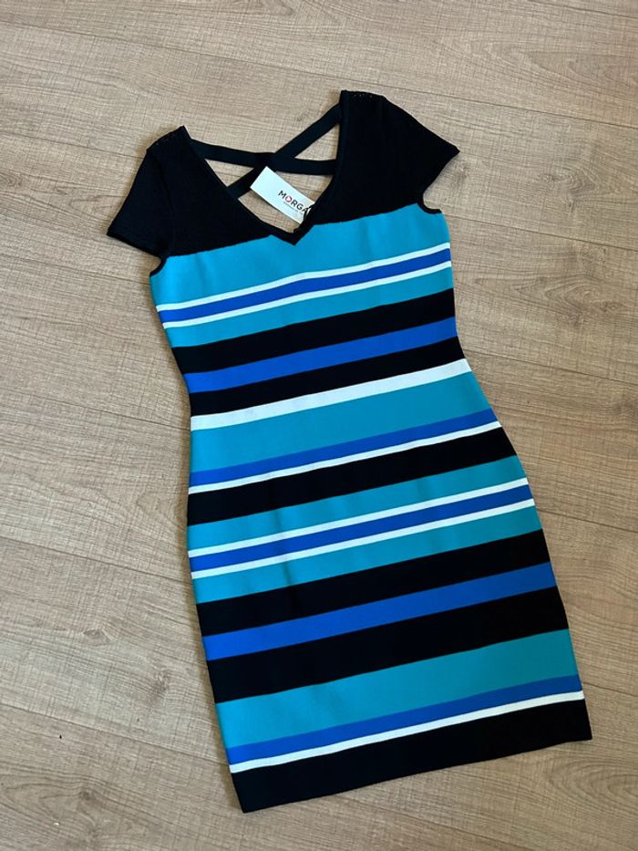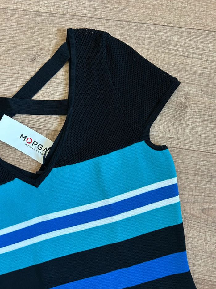 Magnifique robe rayée bleue turquoise, noire et blanche, à manches courtes, de marque Morgan. Taille L. Elle est neuve avec étiquette (valeur 55€). aisselle à aisselle 45 cms et plus épaule à épaule 37 cms et plus taille 39 cms et plus longueur depuis épaule 91 cms Le tissu est extensible 51% viscose et 49% polyamide Le prix reste négociable dans la limite du raisonnable. Un petit cadeau dans le colis 🌸 (Boîte 17)