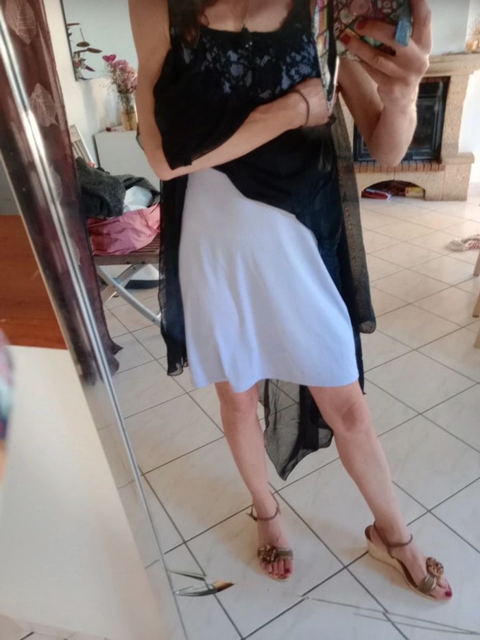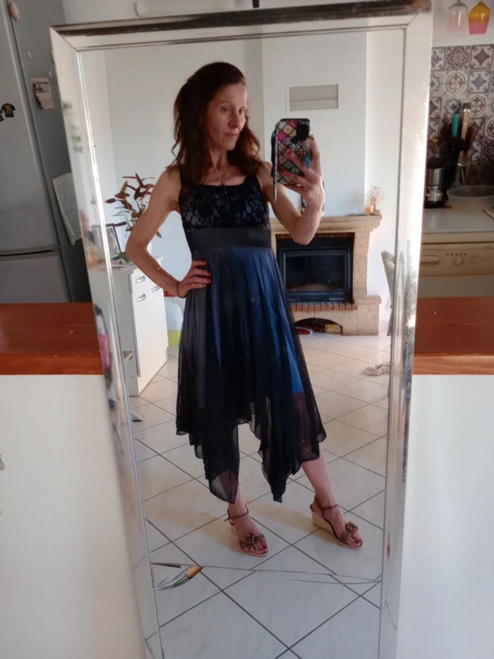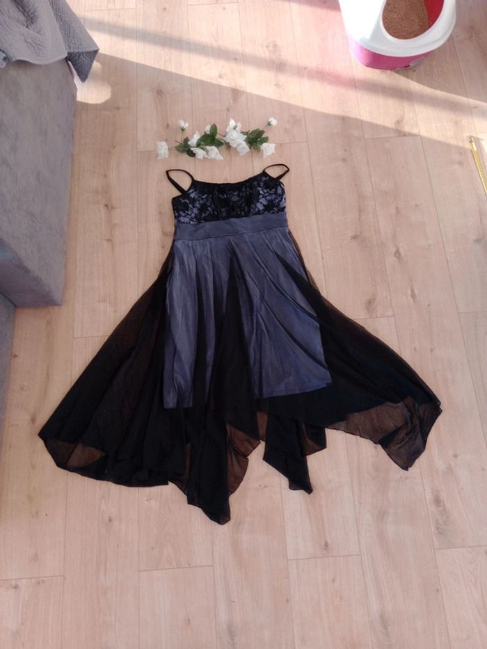 Splendide😍🥰cette robe est composée d'une doublure de couleur lilas sur laquelle vient se superposer un tulle pour la partie basse de couleur noire Asymétrique pour donner de la légèreté à ce tulle Longueur de la partie la plus haute 75 cm Longueur la plus longue 114 cm Au niveau du buste dentelé avec de jolies fleurs Les bretelles sont réglables #carineleray_femme_36 #carineleray_femme_38