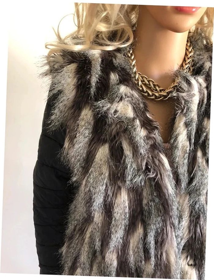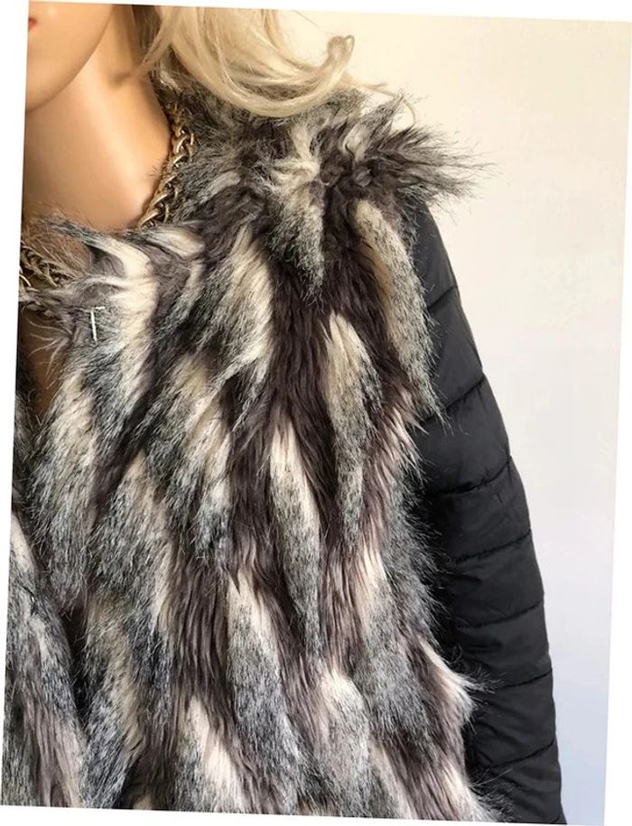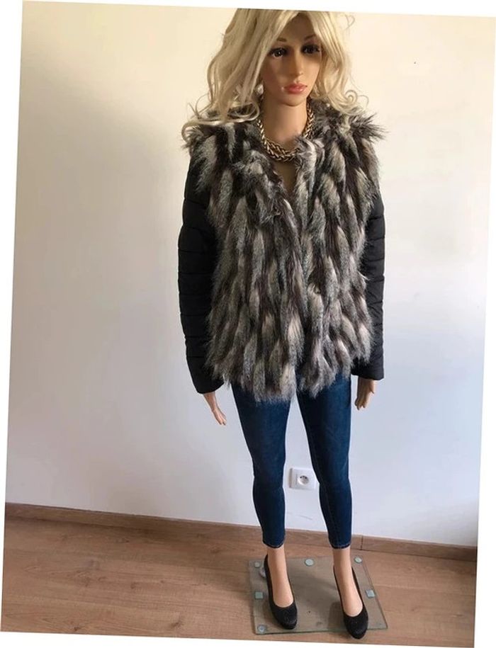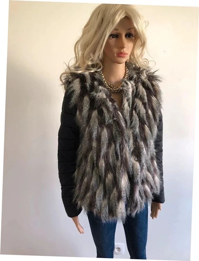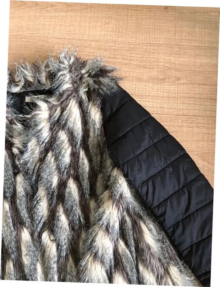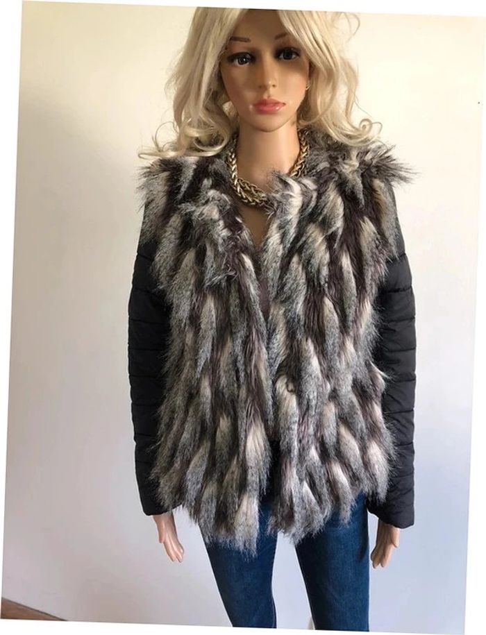 Jolie doudoune matelassée noire, avec fausse fourrure grise et beige, de marque Molly Bracken. Se ferme à l’aide de crochets. Taille S. Portée une saison, en très bon état. aisselle à aisselle 46 cms épaule à épaule 38 cms longueur manches 62 cms taille 45 cms longueur depuis épaule 60 cms 100% polyester Le prix reste négociable dans la limite du raisonnable. Un petit cadeau dans le colis.