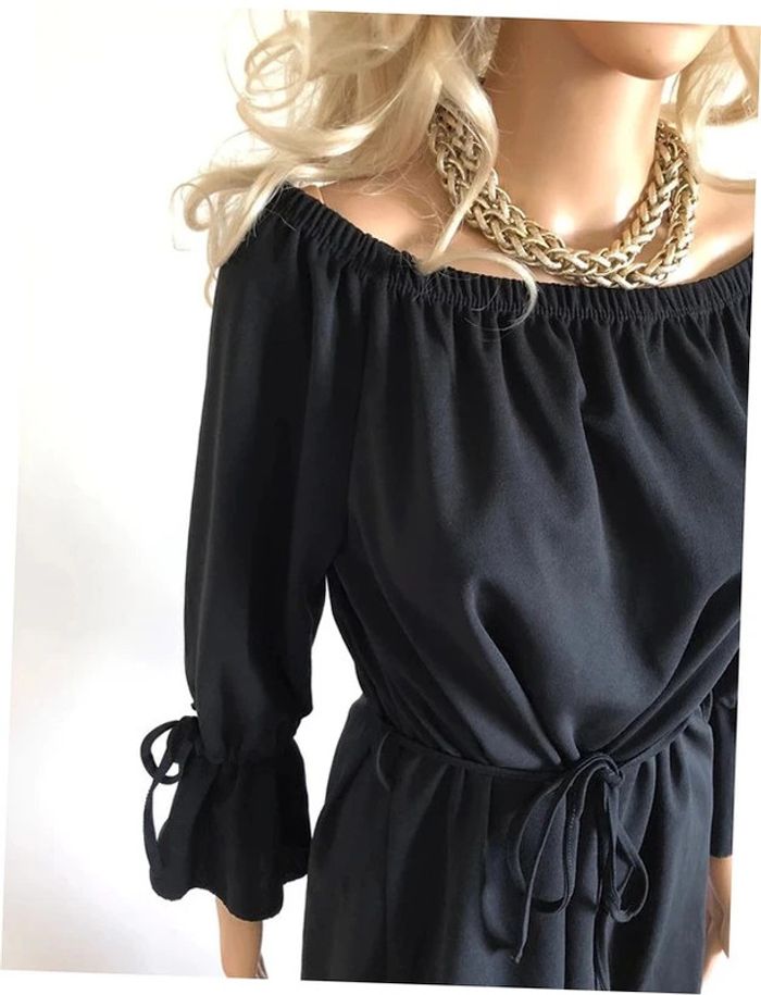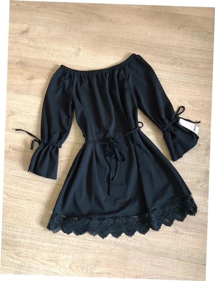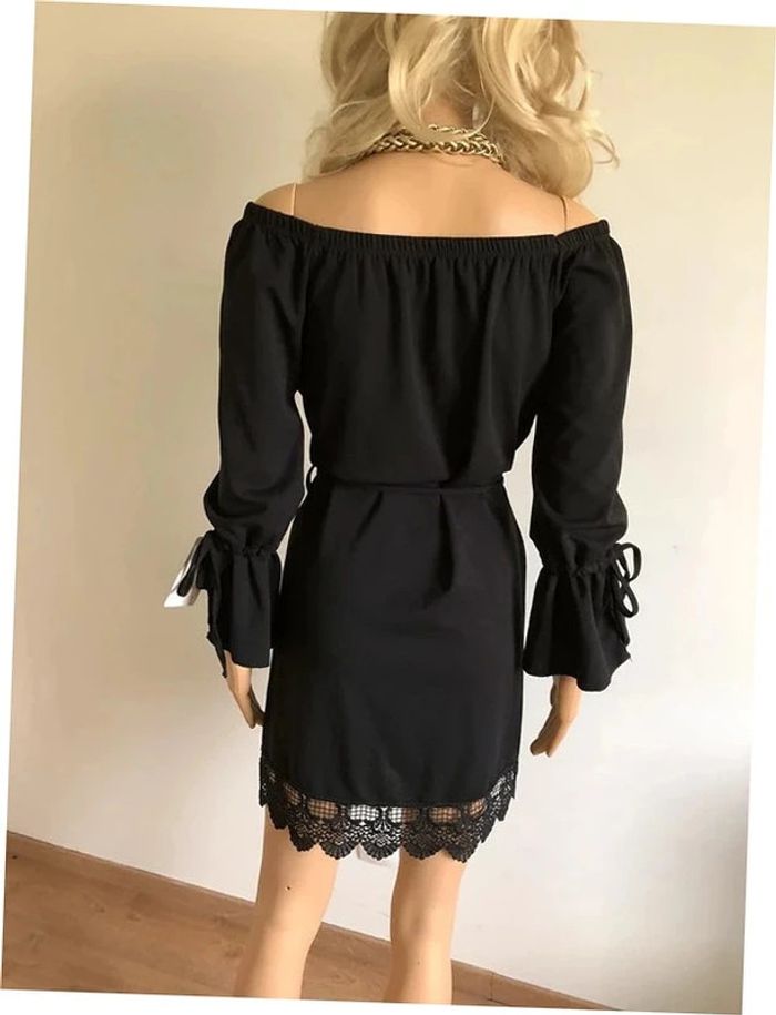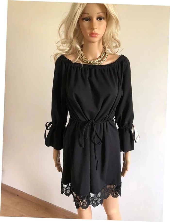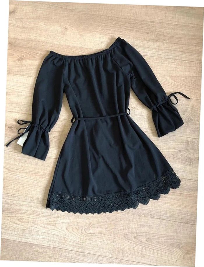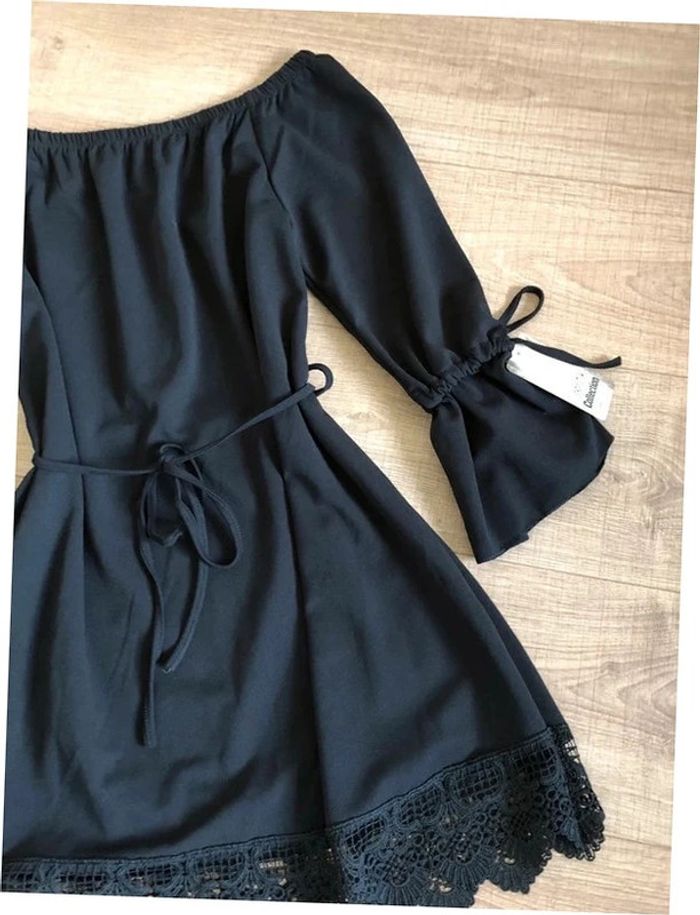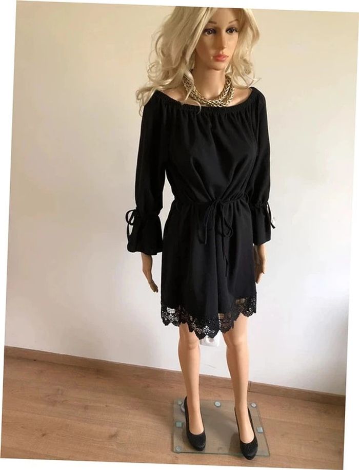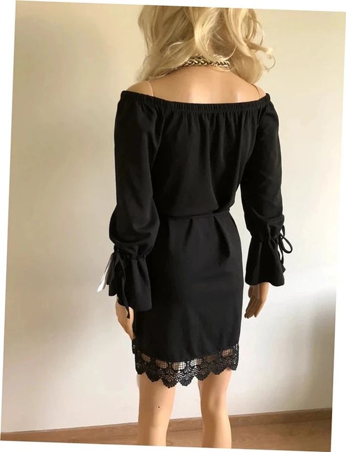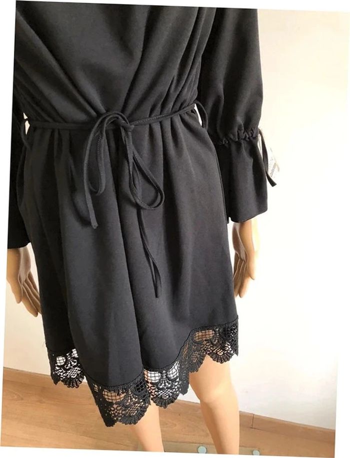 Jolie robe noire avec manches 3/4 et dentelle sur le bas et noeud à nouer au niveau de la taille. Taille unique qui convient jusqu’au 38. Elle est neuve avec étiquette. aisselle à aisselle 51 cms taille 52 cms longueur depuis épaule 83 cms Le tissu est extensible 95% polyester et 5% elasthanne Le prix reste négociable dans la limite du raisonnable. Un petit cadeau dans le colis. (Boîte 16)