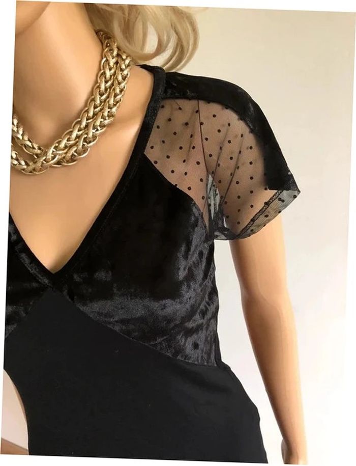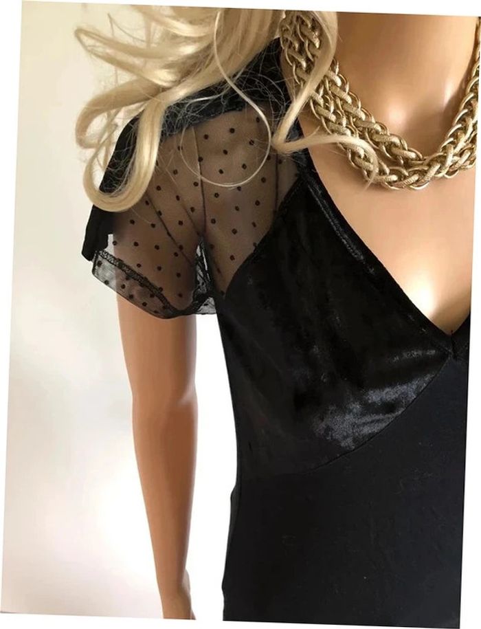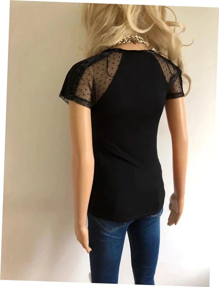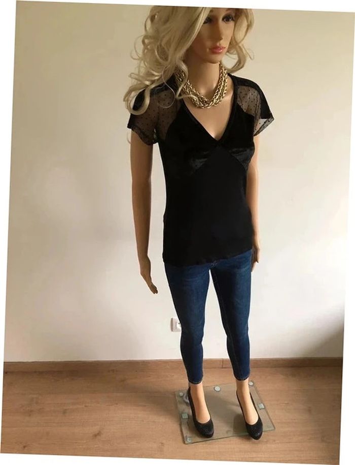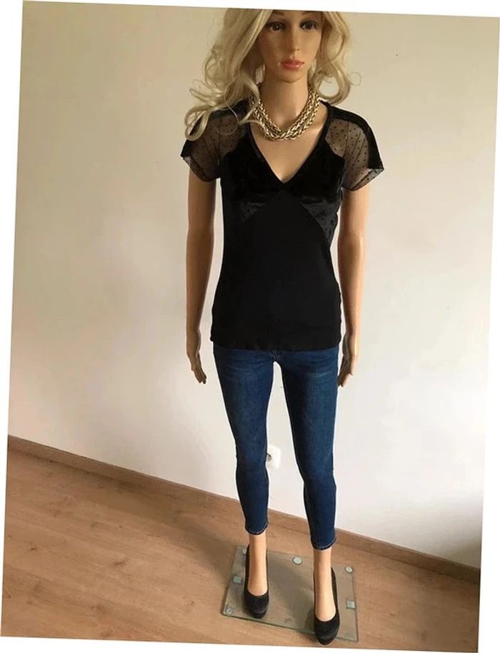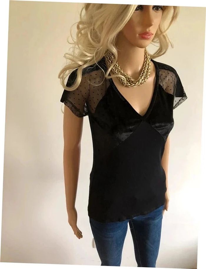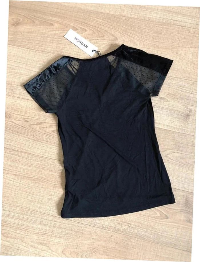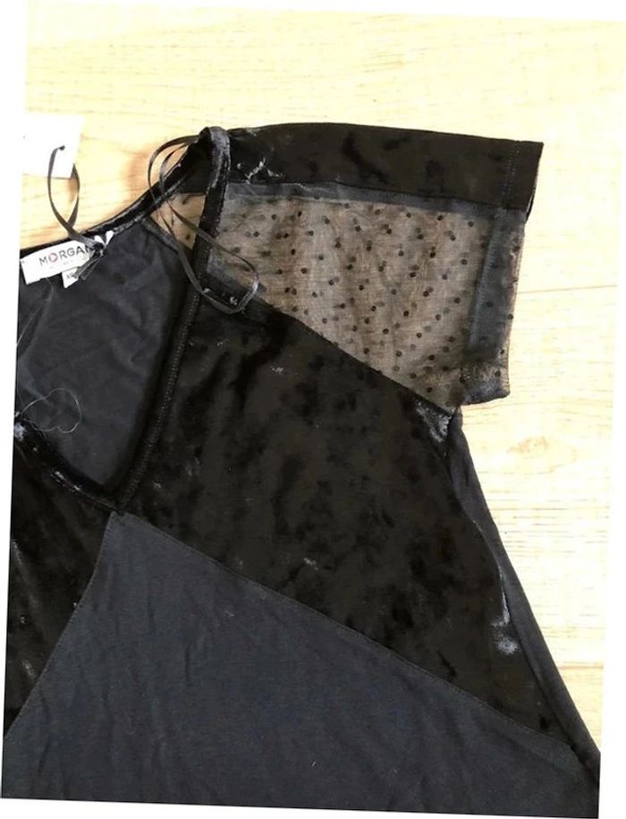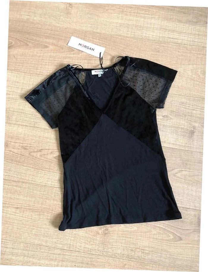 Magnifique haut noir à manches courtes, avec empiècements transparents et en velours, de marque Morgan. Taille XS. Il est neuf avec étiquette (valeur 30€). Jamais porté car trop petit pour moi. aisselle à aisselle 37 cms et plus taille 34 cms et plus longueur depuis épaule 59 cms Le tissu est extensible 95% viscose et 5% elasthanne Le prix reste négociable dans la limite du raisonnable. Un petit cadeau dans le colis.