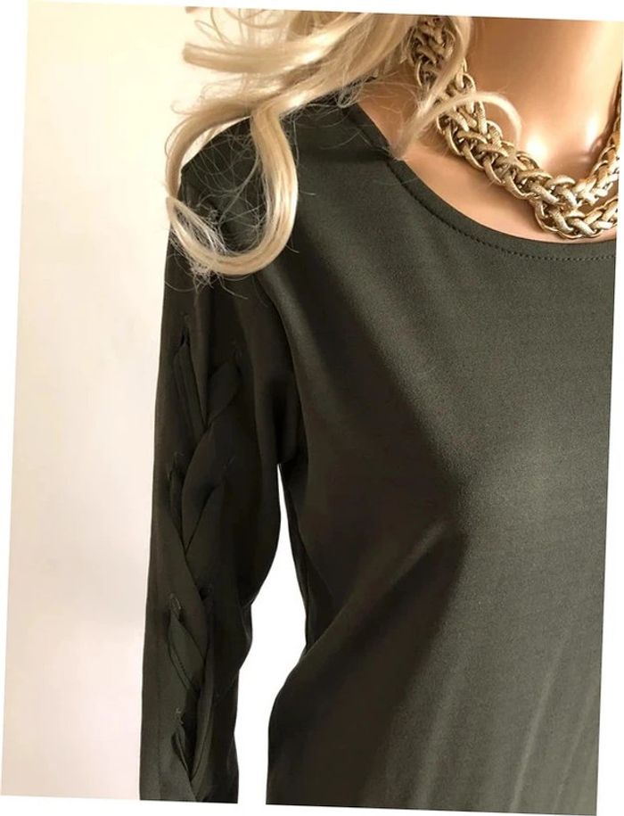 Robe kaki mi longue avec lacets sur les manches. Taille unique qui taille grand et convient plutôt pour un 40/42. Elle est neuve avec étiquette. aisselle à aisselle 51 cms épaule à épaule 39 cms longueur manches 57 cms taille 50 cms longueur depuis épaule 99 cms Le tissu est extensible 95% polyester et 5% elasthanne Le prix reste négociable dans la limite du raisonnable. Un petit cadeau dans le colis. (Boîte 15)