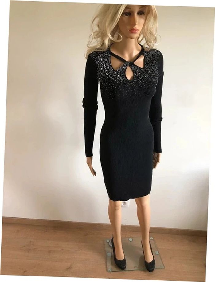 Magnifique robe moulante noire à manches longues, avec strass argentés. Taille unique qui convient jusqu’au 38 (éventuellement petit 40). Elle est neuve avec étiquette. aisselle à aisselle 38 cms à 54 cms épaule à épaule 35 cms a 44 cms longueur manches 60 cms taille 32 cms à 45 cms longueur depuis épaule 94 cms Le tissu est très extensible 90% viscose et 10% elasthanne Le prix reste négociable dans la limite du raisonnable. Un petit cadeau dans le colis. (Boîte 50)