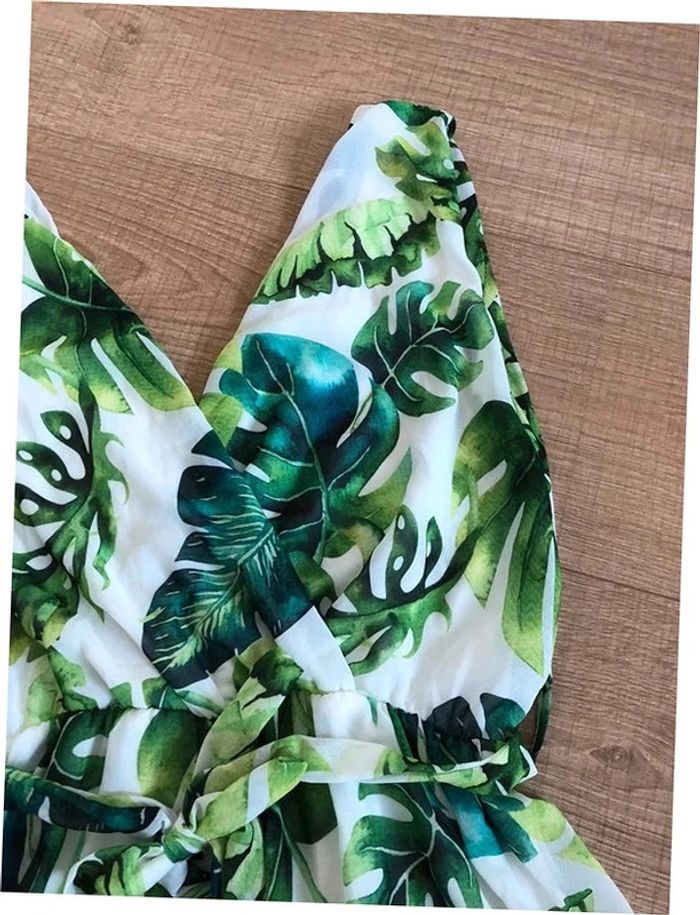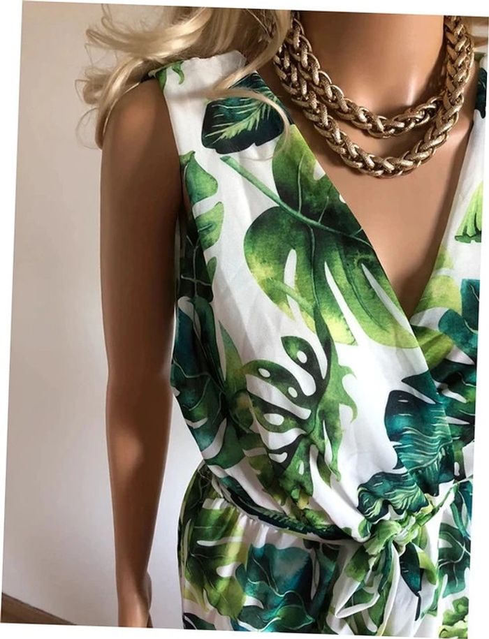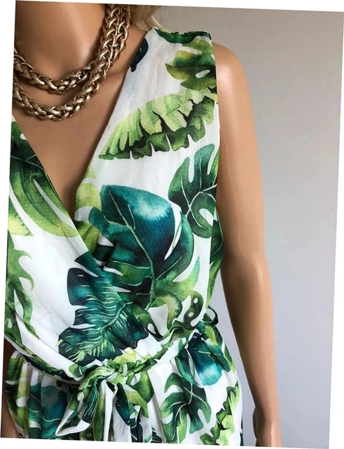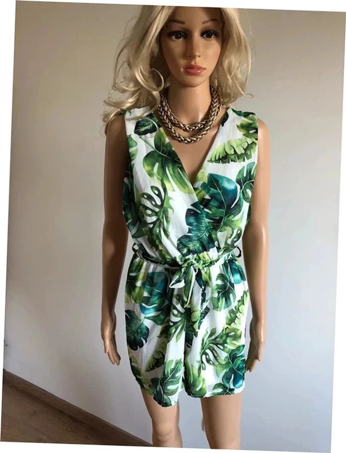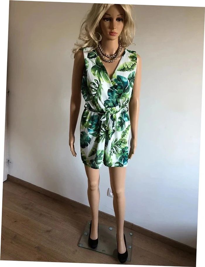 Joli combishort blanc et vert sans manches, avec noeud à la taille. Taille unique qui convient pour du 34/36. Porté une ou deux fois, en très bon état. taille 34 cms a 49 cms longueur depuis épaule 73 cms 80% polyester et 20% viscose Le prix reste négociable dans la limite du raisonnable. Un petit cadeau dans le colis.