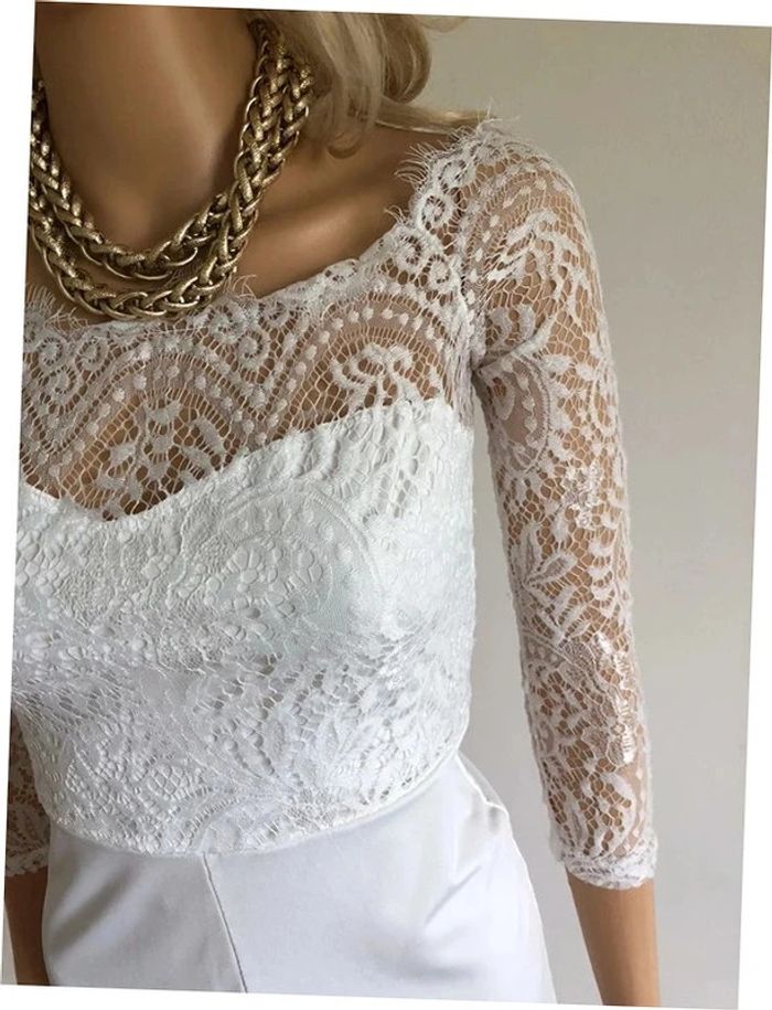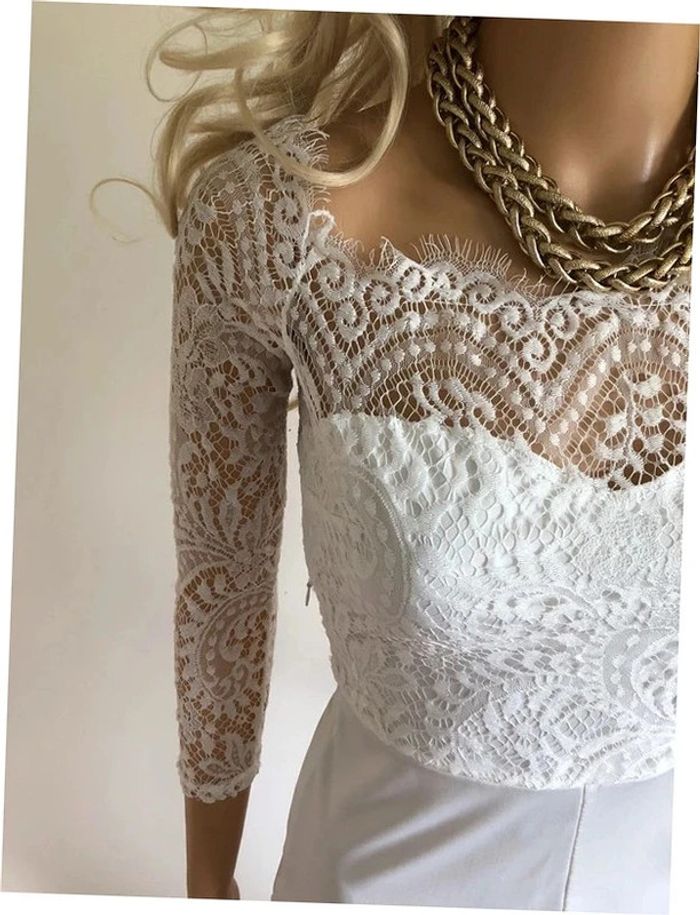 Jolie combishort blanche avec de la dentelle et manches 3/4. Taille M qui taille petit (voir mesures en dessous). Fermeture sur le côté. Jamais portée car trop petite pour moi. aisselle à aisselle 39 cms taille 36 cms longueur depuis épaule 69 cms 95% polyester et 5% elasthanne Le prix reste négociable dans la limite du raisonnable. Un petit cadeau dans le colis. (Boîte 47)