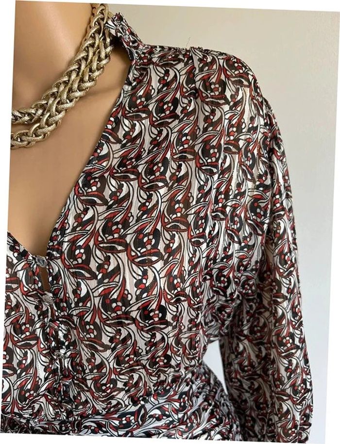 Magnifique robe imprimée avec manches 3/4, de marque Morgan. Fermeture dans le dos et petits liserés argentés sur toute la robe. Taille 40. Elle est neuve avec étiquette (valeur 75€). aisselle à aisselle 49 cms épaule à épaule 42 cms taille 39 cms longueur depuis épaule 88 cms 98% polyester et 2% fil métallisé Le prix reste négociable dans la limite du raisonnable. Un petit cadeau dans le colis 🌸 (Boîte 19)