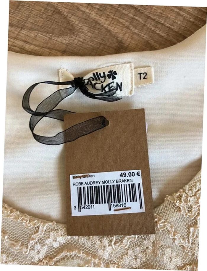 Magnifique robe beige dorée en dentelle, sans manches, de marque Molly Bracken. Taille 2 qui correspond à un 38. Elle est neuve avec étiquette (valeur 49€). aisselle à aisselle 45 cms taille 37 cms longueur depuis épaule 87 cms Le tissu est extensible 50% polyester, 45% polyamide et 5% polyuréthane Le prix reste négociable dans la limite du raisonnable. Un petit cadeau dans le colis 🌸
