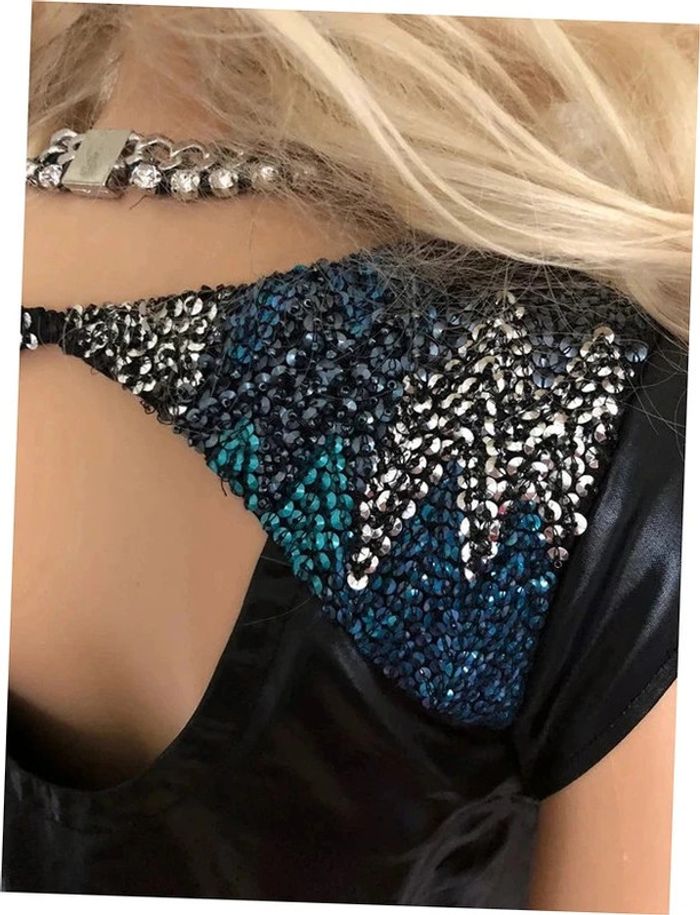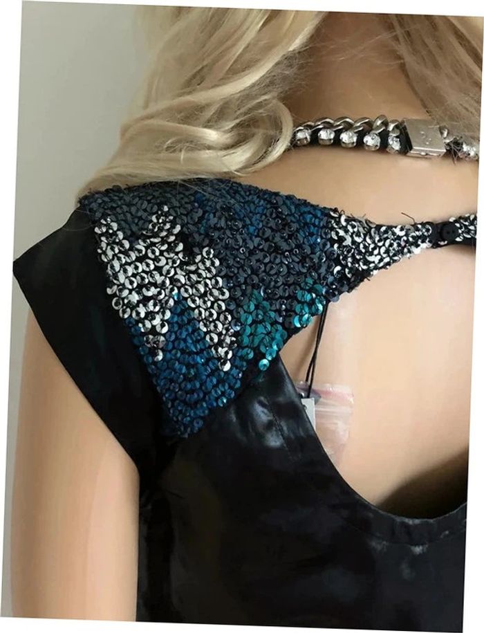 Magnifique robe noire satinée sans manches, de marque One Step. Sequins dans le haut du dos. Fermeture sur le côté. Taille 36. Elle est neuve avec étiquette (petit défaut, il manque quelques sequins, mais peu visible. La robe est vendue avec un petit paquet de sequins donc possible de les rajouter). aisselle à aisselle 43 cms épaule à épaule 37 cms taille 44 cms longueur depuis épaule 89 cms 100% acetane Le prix reste négociable dans la limite du raisonnable. Un petit cadeau dans le colis 🌸