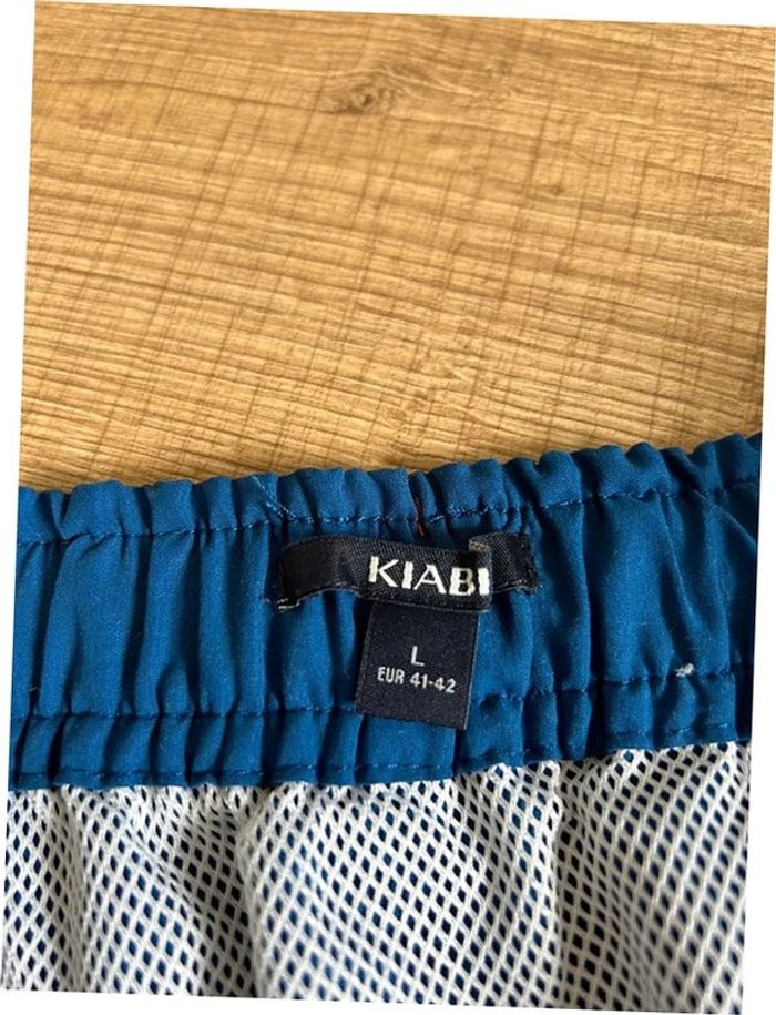 Joli short bleu et blanc pour homme, de marque Kiabi. Taille L. Jamais porté car trop petit, état neuf. taille 37 cms à 42 cms longueur 48 cms La taille est extensible 100% polyester