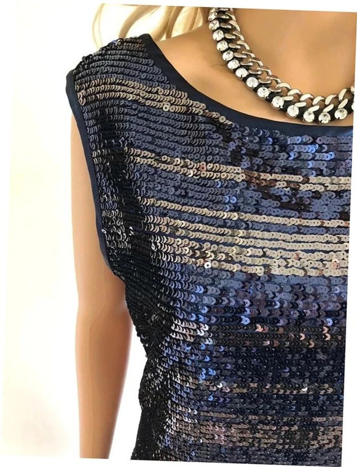 Magnifique robe bleue marine et argentée sans manches, entièrement en sequins, de marque Morgan. Taille M qui peut éventuellement convenir pour un petit L. Elle est neuve avec étiquette. aisselle à aisselle 48 cms taille 43 cms longueur depuis épaule 88 cms 95% polyester et 5% elasthanne Le prix reste négociable dans la limite du raisonnable. Un petit cadeau dans le colis 🌸