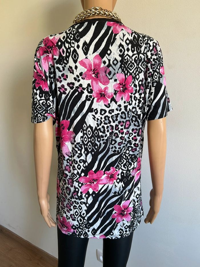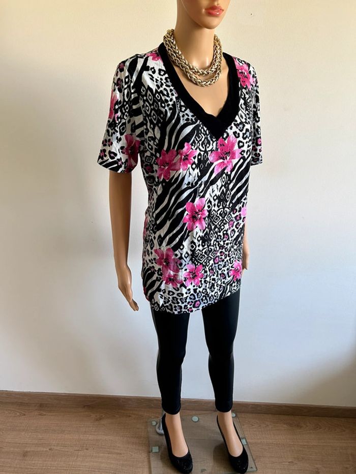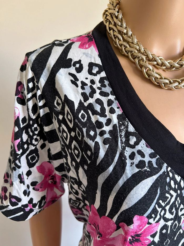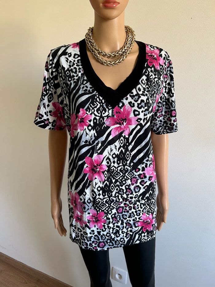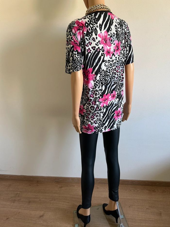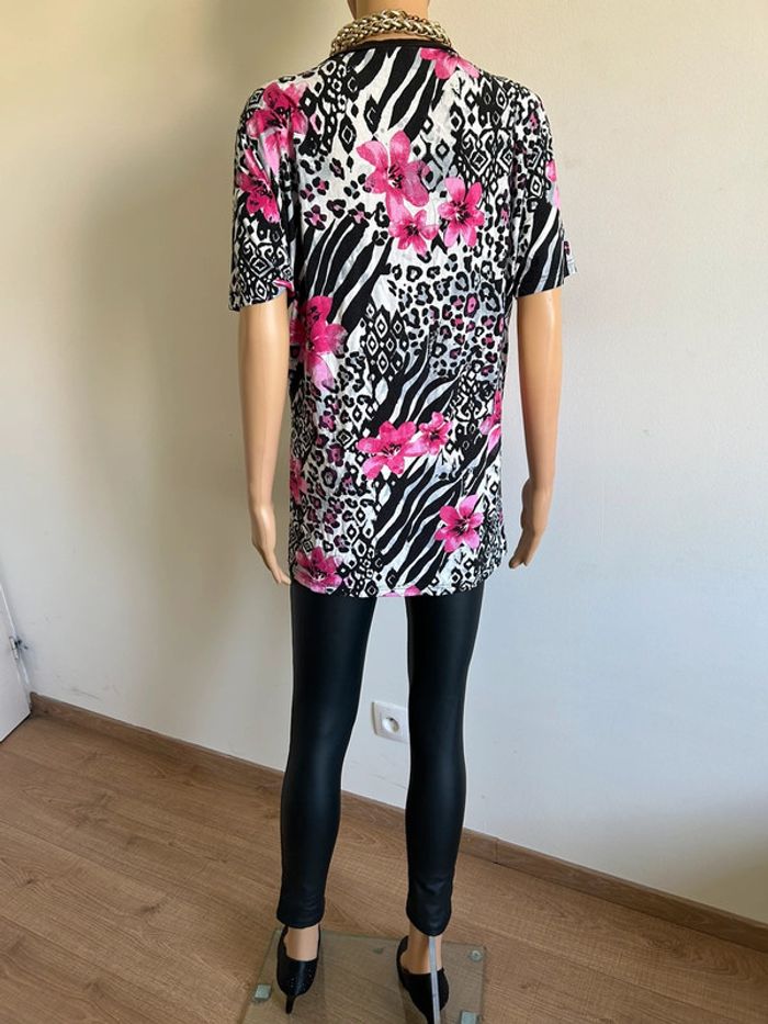 Joli teeshirt imprimée noir blanc et rose, à manches courtes, de marque Canda. Taille L. Porté plusieurs fois, en bon état. aisselle à aisselle 54 cms et plus épaule à épaule 42 cms et plus taille 52 cms et plus longueur depuis épaule 69 cms Le tissu est extensible Étiquette intérieure de composition coupée Le prix reste négociable dans la limite du raisonnable. (Boîte 3)