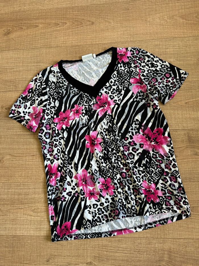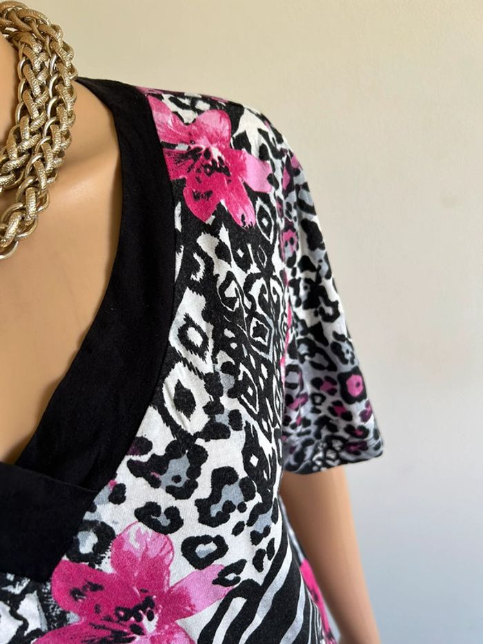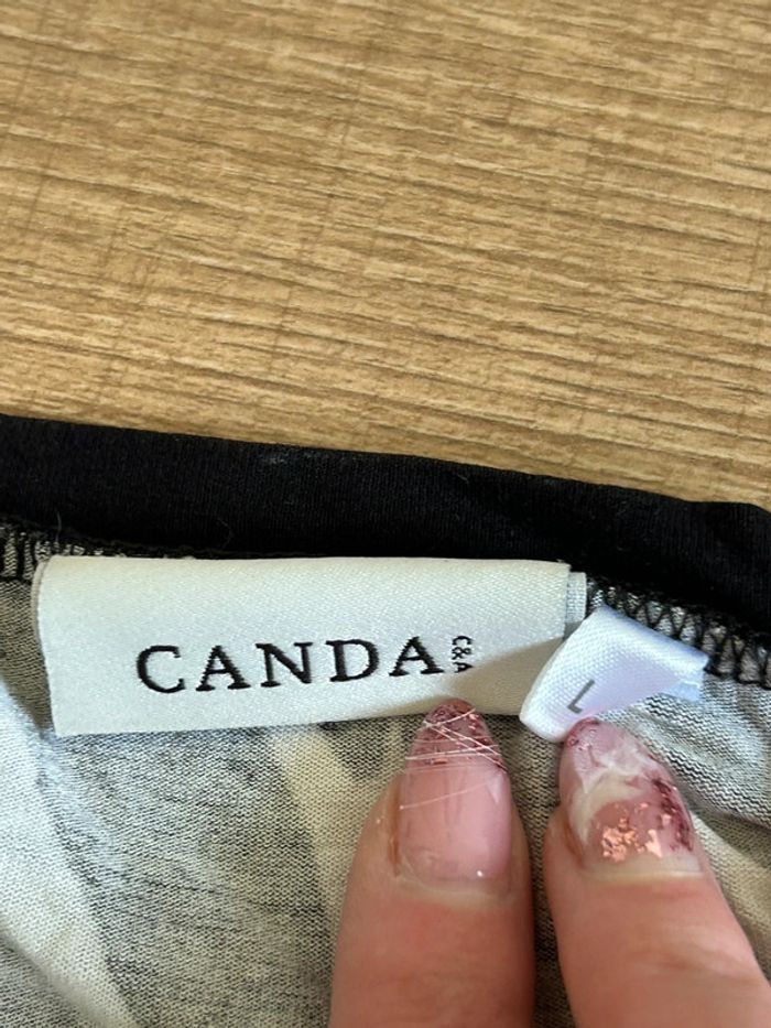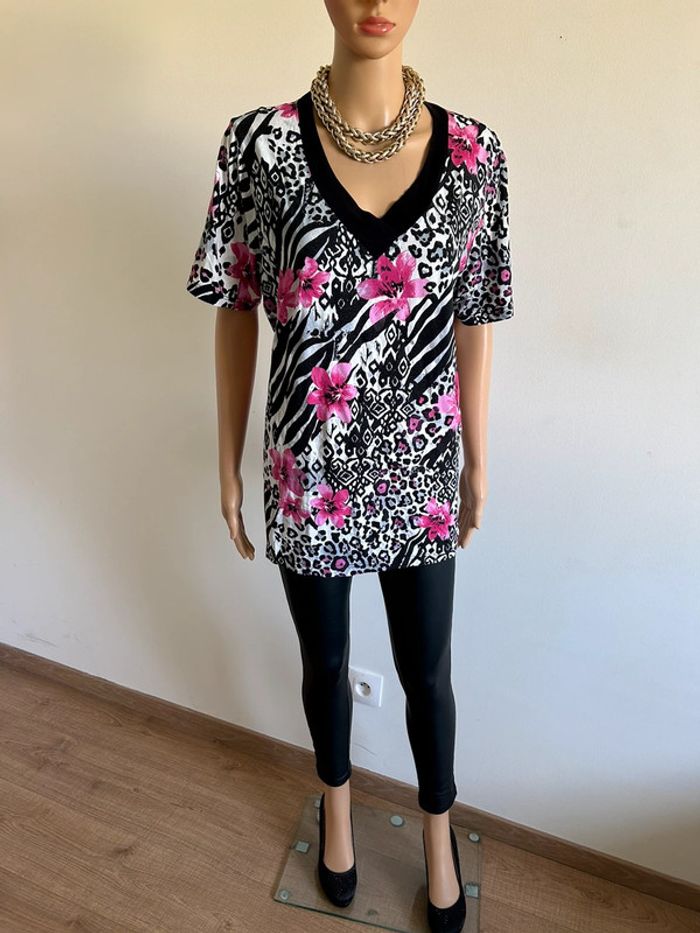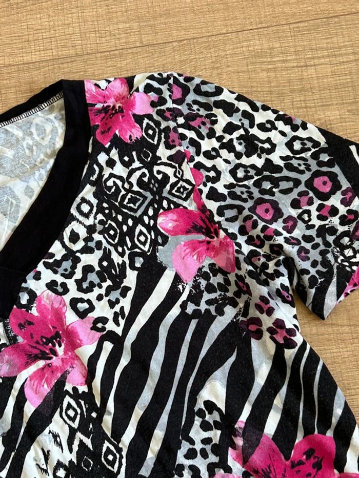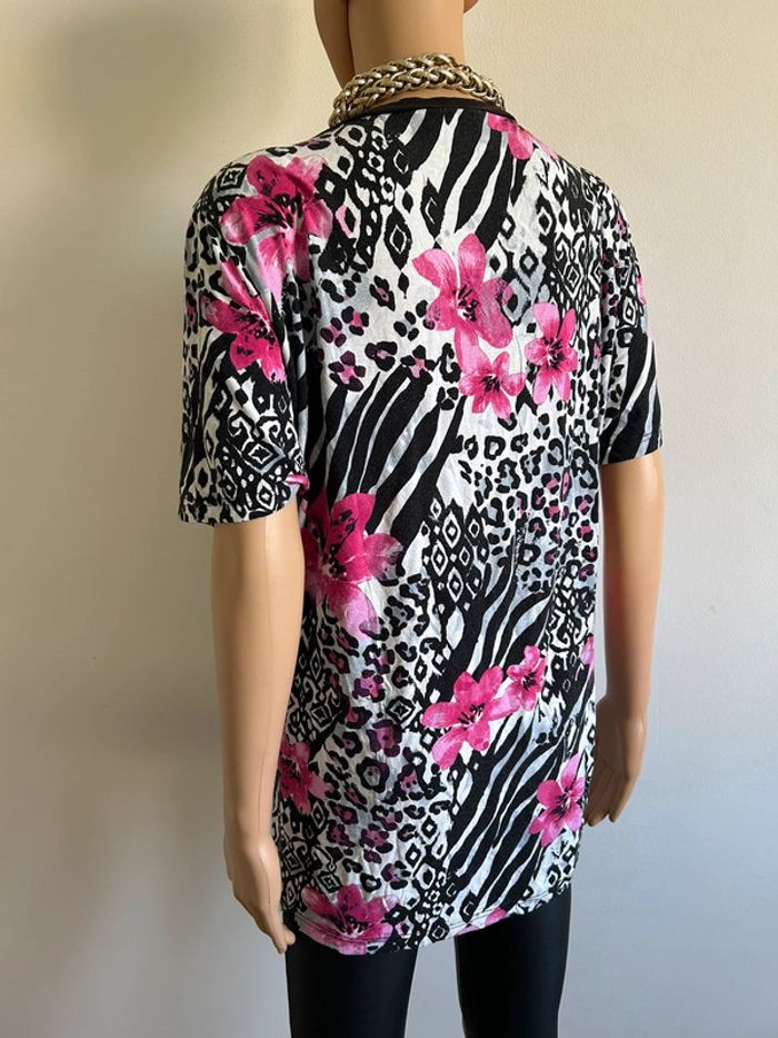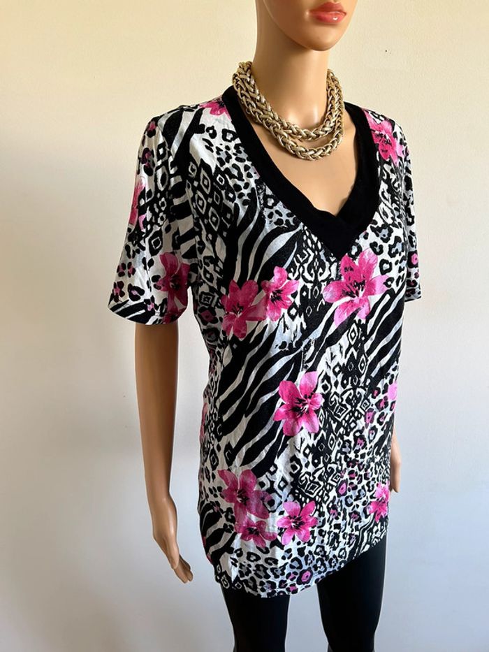 Joli teeshirt imprimée noir blanc et rose, à manches courtes, de marque Canda. Taille L. Porté plusieurs fois, en bon état. aisselle à aisselle 54 cms et plus épaule à épaule 42 cms et plus taille 52 cms et plus longueur depuis épaule 69 cms Le tissu est extensible Étiquette intérieure de composition coupée Le prix reste négociable dans la limite du raisonnable. (Boîte 3)